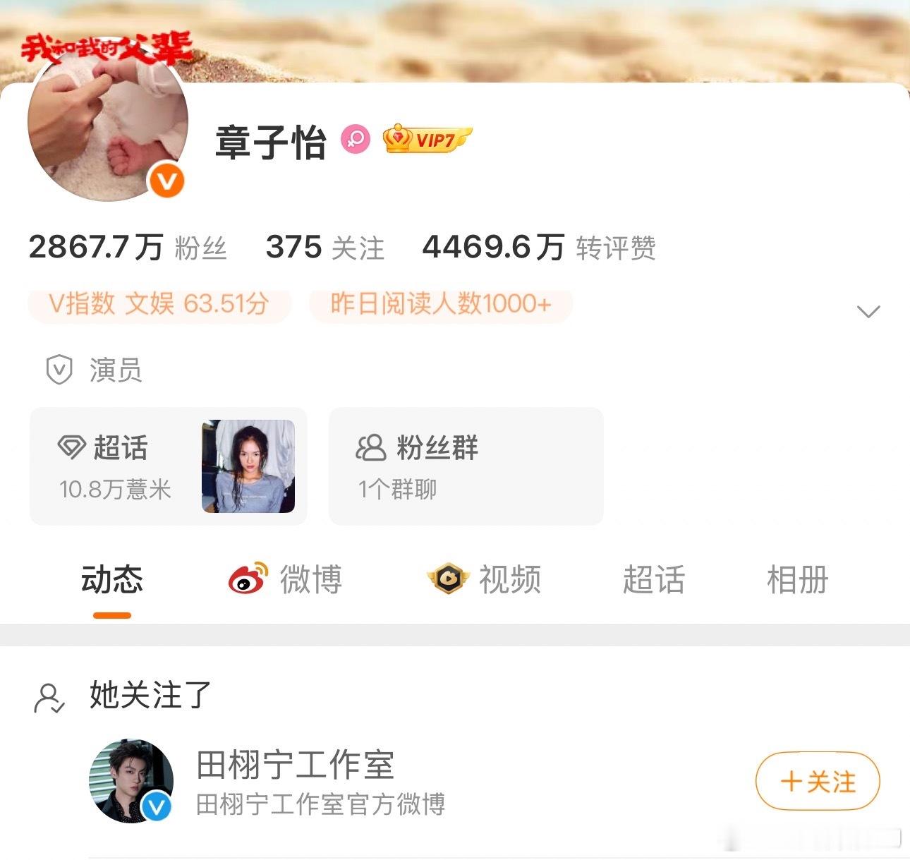 章子怡关注了田栩宁工作室后,又火速去关注田栩宁本人了。章子怡关注田栩宁工作室
