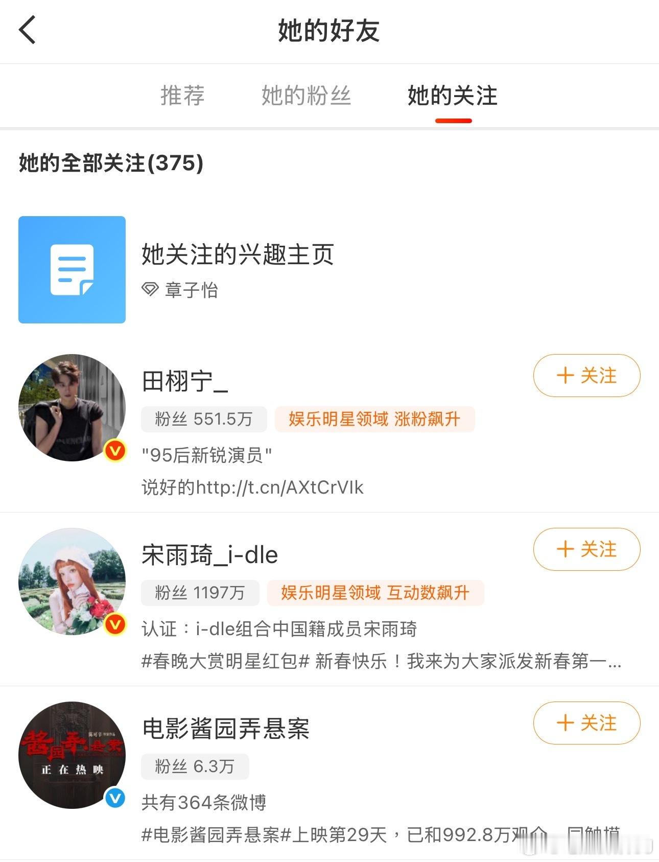 章子怡关注了田栩宁工作室后,又火速去关注田栩宁本人了。章子怡关注田栩宁工作室