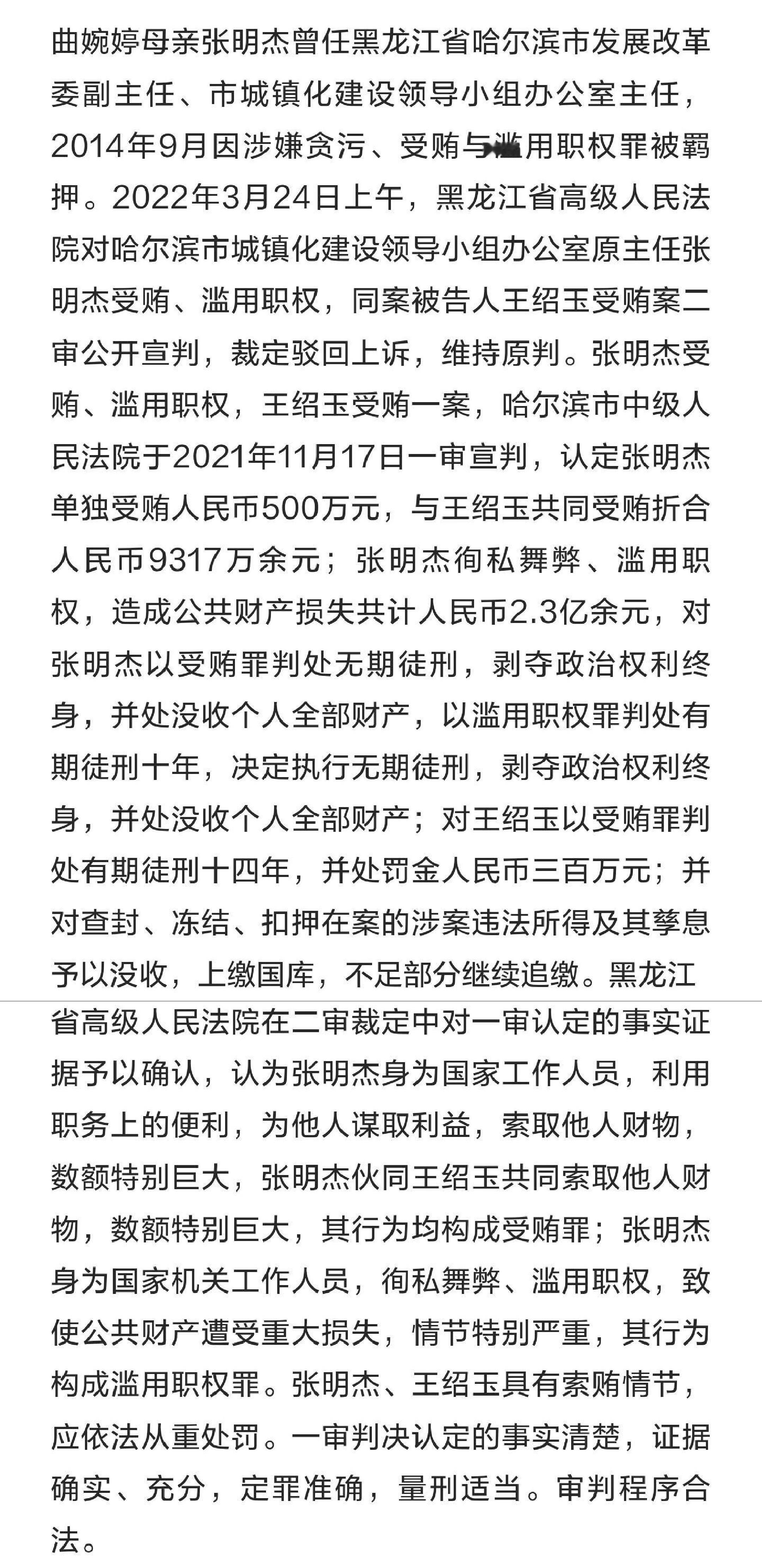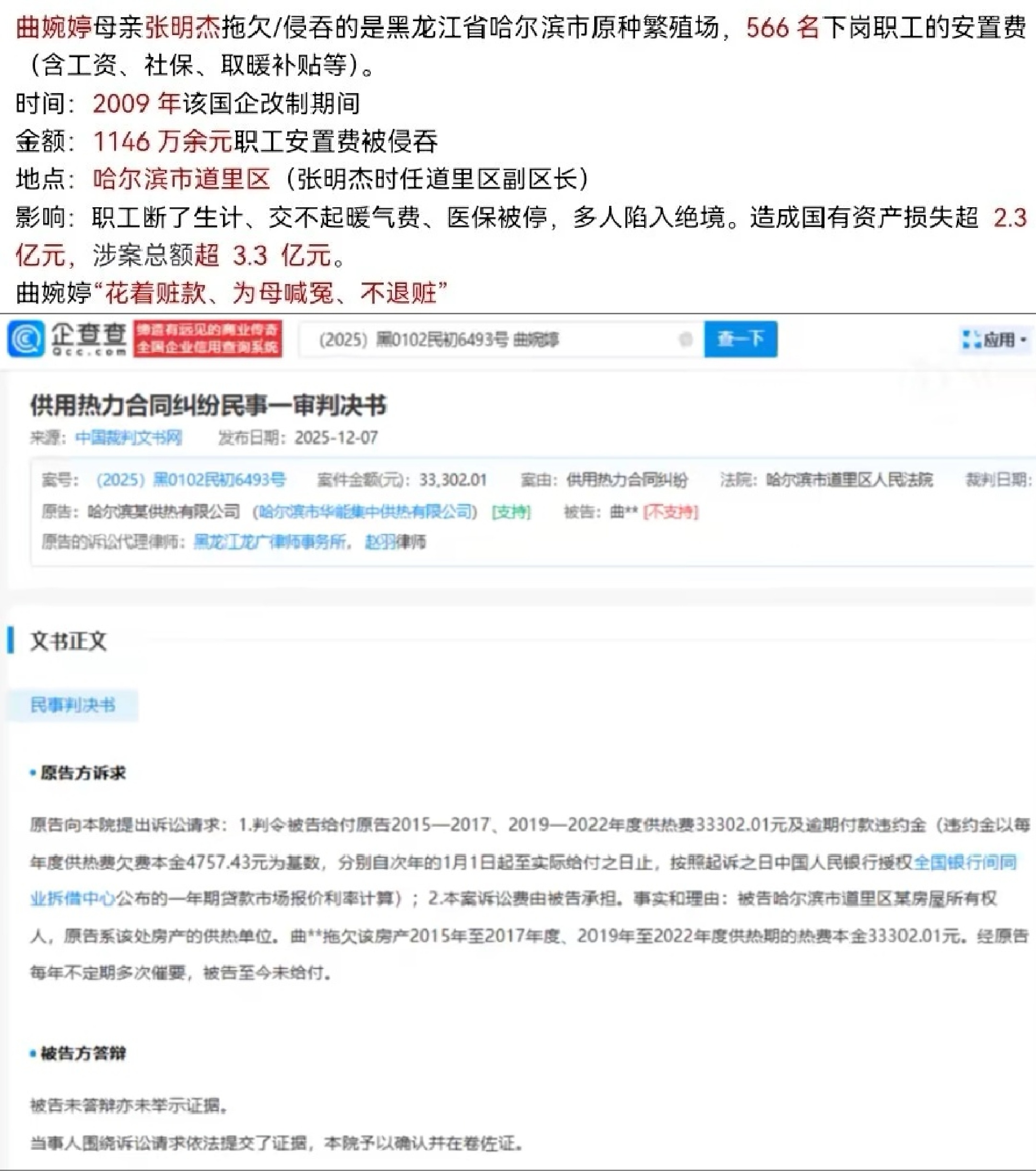 近日,曲婉婷试图在国内平台复出,账号开通不足24小时即被封禁。曲婉婷母亲张明杰涉案金额高达3.5亿元,2021年被判处无期徒刑,剥夺政治权利终身,并处没收个人全部财产。自母亲2014年被羁押后,曲婉婷长期滞留加拿大温哥华,购置豪宅、豪车,与温哥华市长恋爱,过着优渥生活,从未回国配合调查或探望母亲。曲婉婷长期生活海外从未退还款项曲婉婷欠缴多年暖气费合计3.3万