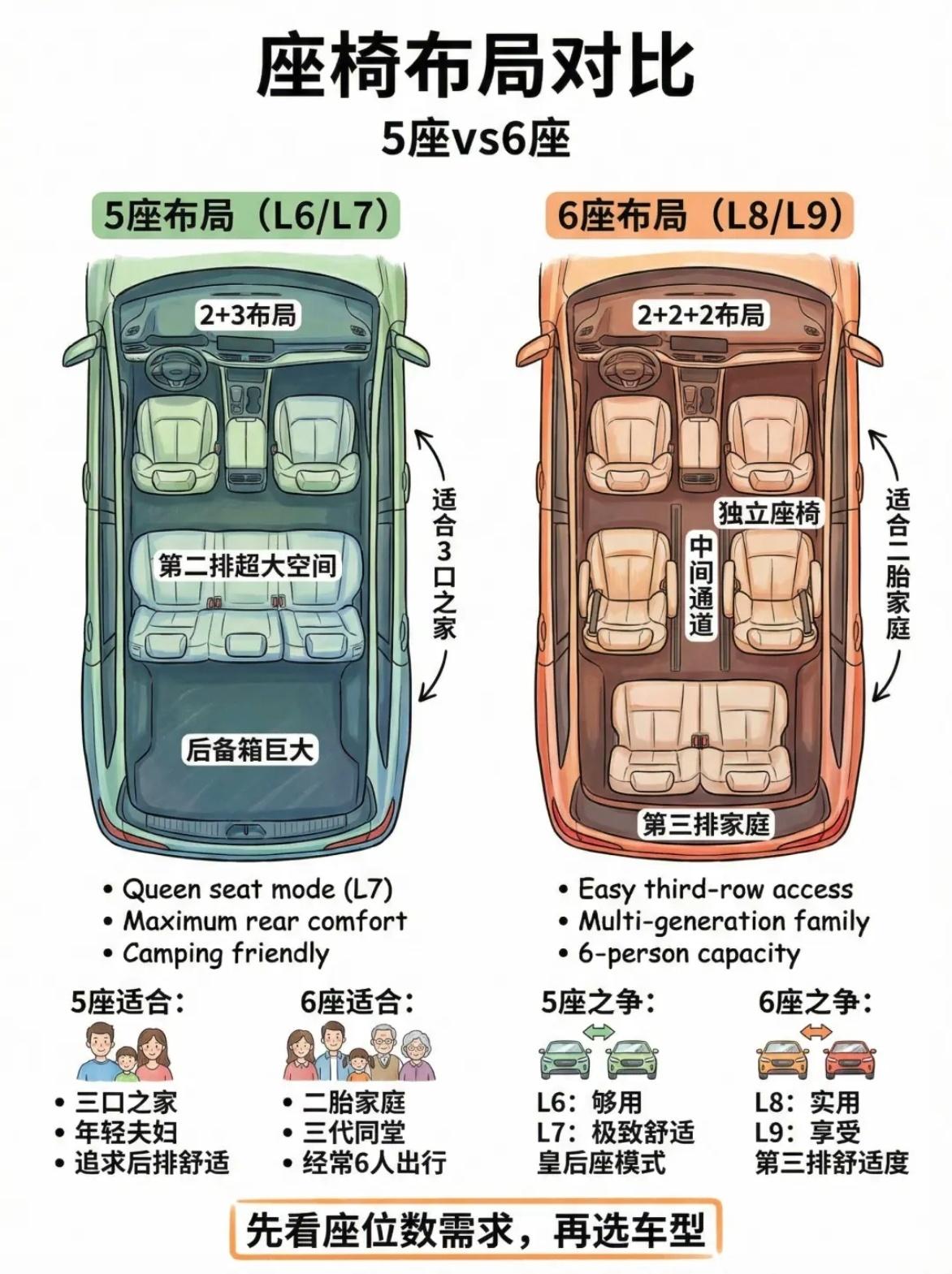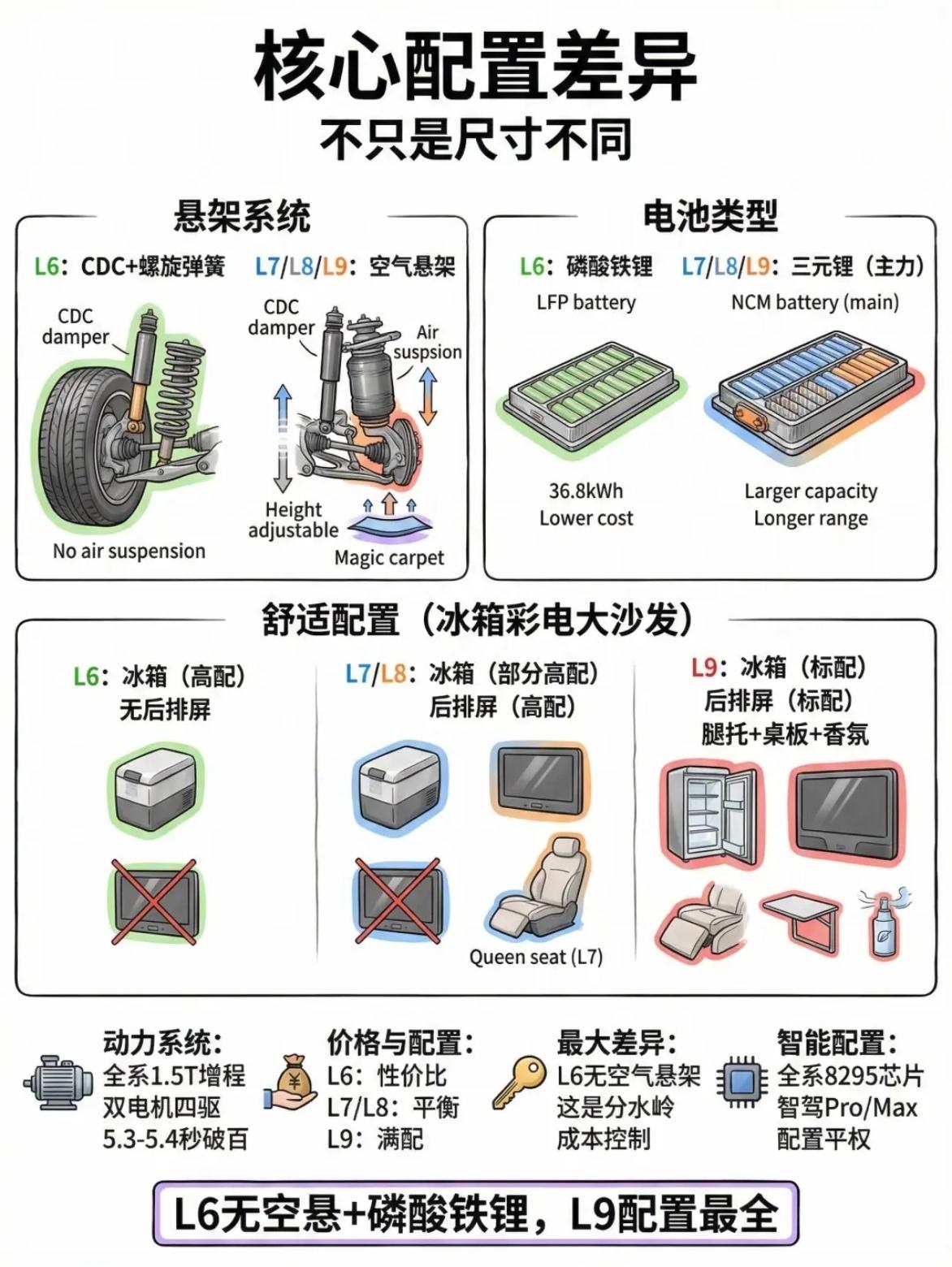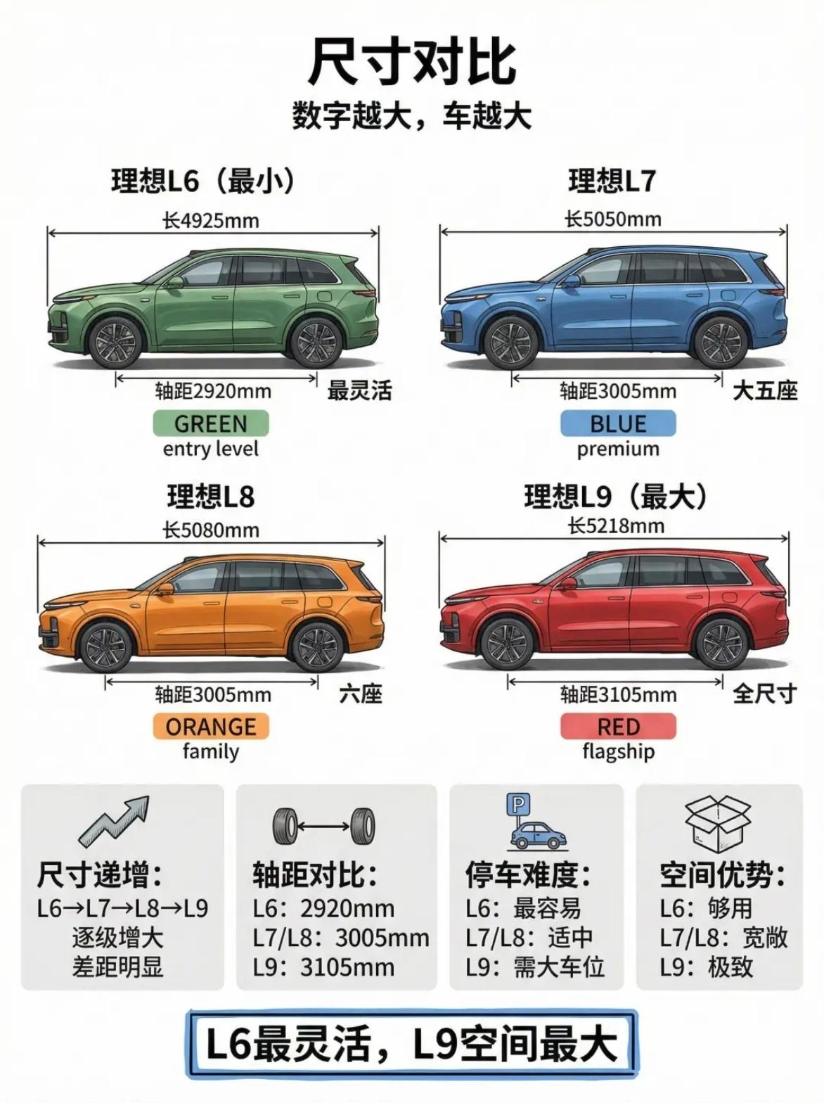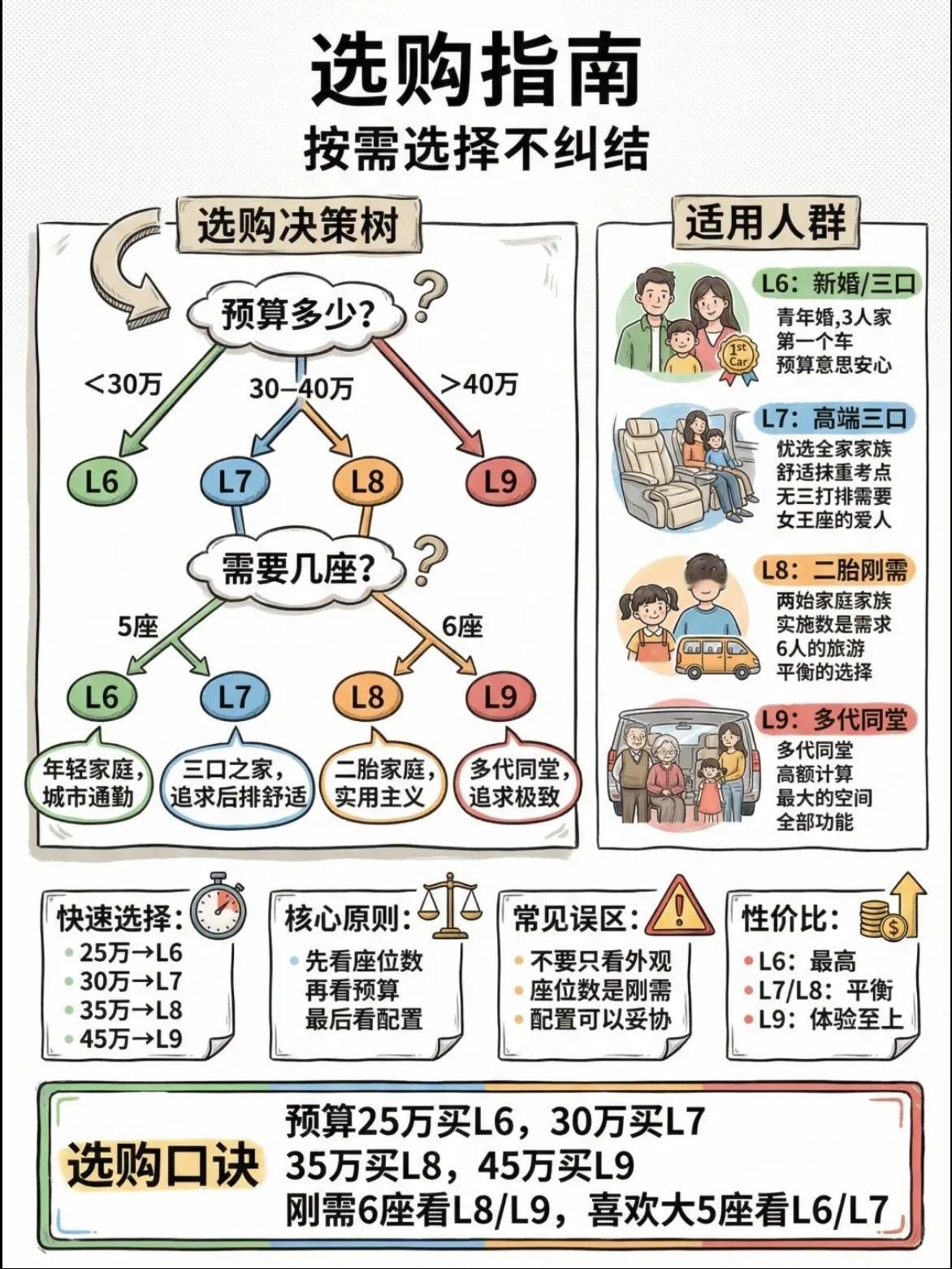 理想L家族车型让人傻傻分不清?理想汽车L系列共有四款车型,分别是L6、L7、L8、L9,套娃式的脸让很多人懵圈。 这5张图就能让你分清楚四款车的配置差异、价格、座椅布局、和购买人群。 你们喜欢理想的哪一款车型呢?