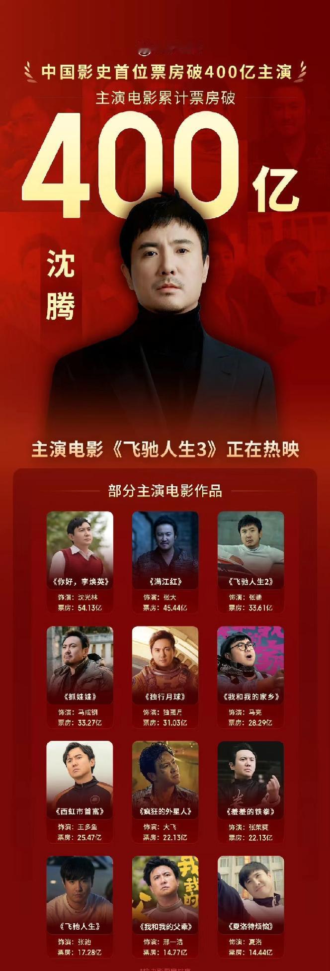 沈腾主演电影票房突然400亿,那么是否可以认为沈腾是中国电影票房方面的第一人呢? 我觉得不是,毕竟现在电影票价比以前涨了很多,如果去掉通货膨胀,至少有4位演员票房要比沈腾高。 1、成龙,不用多说,华人第一影星。 2、周星驰,一百年才出一个。 3、周润发,无数经典作品。 4、李连杰,光一部《少林寺》,如果放现在,起码60亿吧。