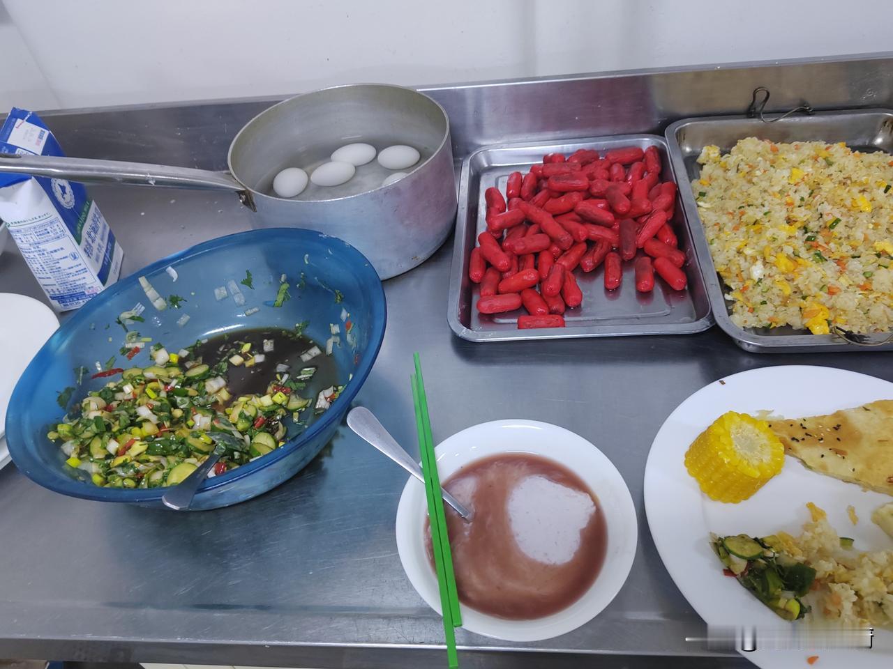 今天的早餐做了蒸包,油饼,蛋炒饭,糯玉米,香肠,鸡蛋,小咸菜,熬的八宝粥,还有牛奶。 这个香肠,还是去年6月份在国内船厂修船的时候上的,也不知道为商家加的什么,颜色这么的鲜艳,中国船员很少吃,基本上都被菲律宾船员吃了。 今天吃早餐的时候,有个哥们问我说,大厨,这香肠是国内上的?我说是的,中国食品,符合中国人的胃口,他说,不对,符合菲律宾人的胃口,都被菲律宾船员吃了,中国人很少有吃的,我接着又说,不是不符合中国人的胃口,是中国人太挑剔了,他听了后,不再说话了。 我寻思着,难道我又说错话了吗?中国人确实很挑剔,菲律宾船员只要有米饭就好了,而中国人就不行了!