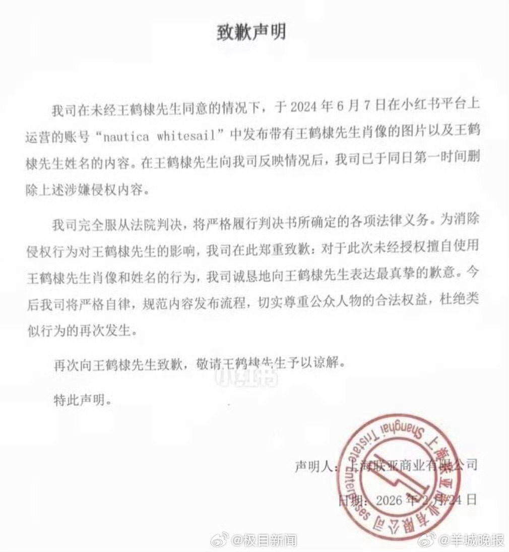 【#知名潮牌发布王鹤棣同款种草文败诉#】#侵权王鹤棣潮牌曾辩称只发布了1天#2月24日,上海联亚商业有限公司发布致歉声明:我司在未经王鹤棣先生同意的情况下,于2024年6月7日在小红书平台上运营的账号“nautica whitesail”中发布带有王鹤棣先生肖像的图片以及王鹤棣先生姓名的内容。在王鹤棣先生向我司反映情况后,我司已于同日第一时间删除上述涉嫌侵权内容。我司完全服从法院判决,将严格履行判决书所确定的各项法律义务。#侵权王鹤棣潮牌一审被判赔7千#