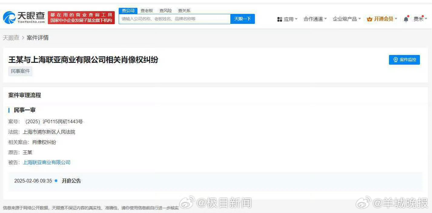 据此前天眼查App显示,近日王鹤棣与上海联亚商业有限公司相关肖像权纠纷案件新增开庭公告,原告为王鹤棣,该案于2月6日在上海市浦东新区人民法院开庭。
