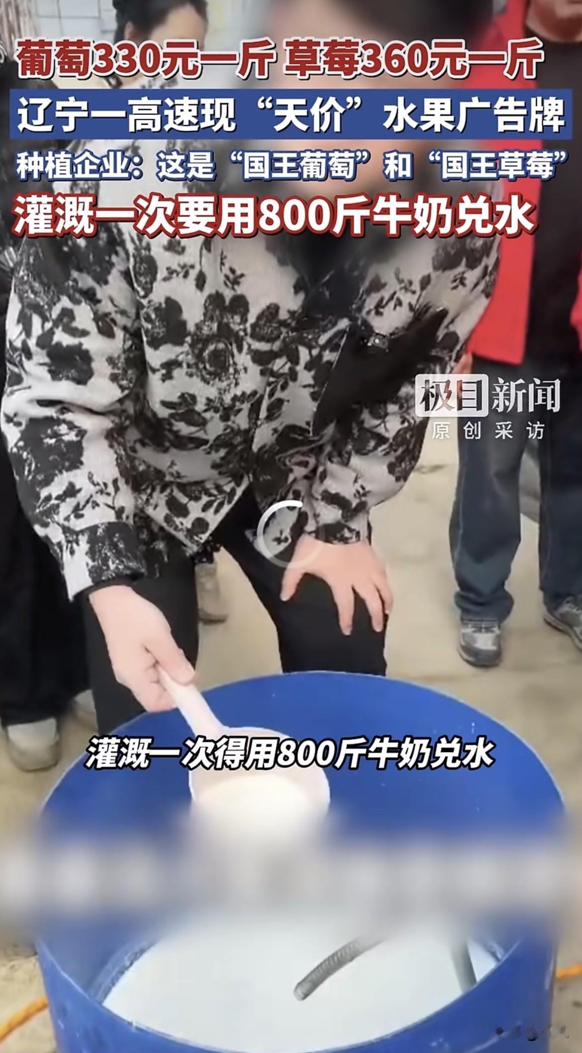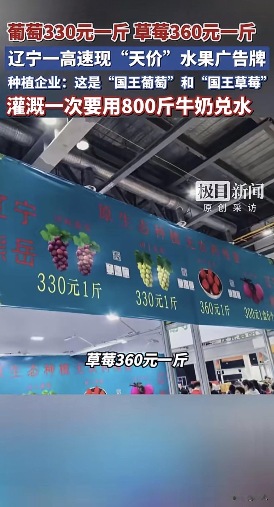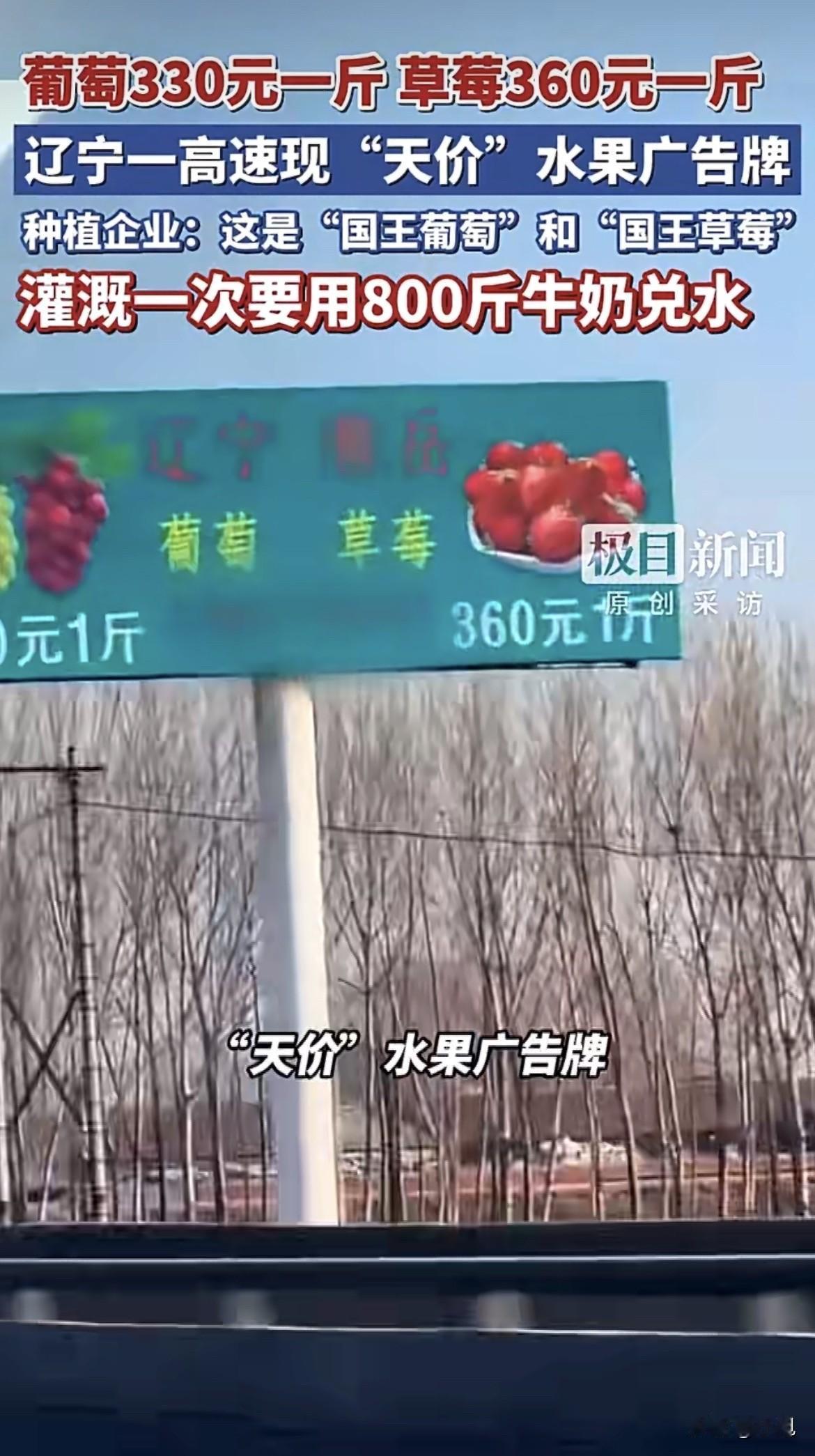 破防了。葡萄330一斤,草莓360一斤,这价格把辽宁一个网友看傻了。 2月23号,有人在高速上拍到一块广告牌,上面明晃晃写着“葡萄330元/斤、草莓360元/斤”,产地是辽宁熊岳。拍视频的人说,我本地人都惊呆了。 评论区炸了。有网友说从沈阳去大连路上也看到这块牌子,当时吓得一嘚瑟。还有人说在贵州高速上也见过同款,以前一百多两百多,现在直接干到300多了。 真有这么贵的水果? 记者拨了广告牌上的电话,销售人员说,这事是真的。水果是辽宁营口一家农业公司种的,品种叫“国王葡萄”和“国王草莓”,在全国四五十个城市都有配送中心。广告牌上印的是全国统一零售价,批发价400块钱2斤。 凭啥卖这么贵。 销售人员解释,原生态种植,不打农药,用的都是牛奶和有机肥。公司有100多项检测报告,达到无农药残留标准。宣传视频里说得更玄乎,草莓不是一般的土种的,特意拿黑龙江非转基因大豆豆饼养土,高台种植全国独家。苗是中国农科院提供的特殊品种,一颗苗成本就4块钱。灌溉一次草莓,要用800斤牛奶兑水。 听着挺唬人。 但专家出来科普了。河北省食品检验研究院官网说,“牛奶草莓”其实是个品种的名字,不是因为它浇了牛奶才有奶香味,而是这个品种本身就带着牛奶的芳香味道。林业果树研究所的专家说,牛奶里主要成分是水和蛋白质,蛋白质不能被草莓直接吸收,得分解成氨基酸才行,这就相当于施了氮肥。所谓的用牛奶浇灌草莓,根本不现实。 有评论直接问,这到底是原生态的“贵族果”,还是收割“智商税”? 你看完这事啥感觉。
