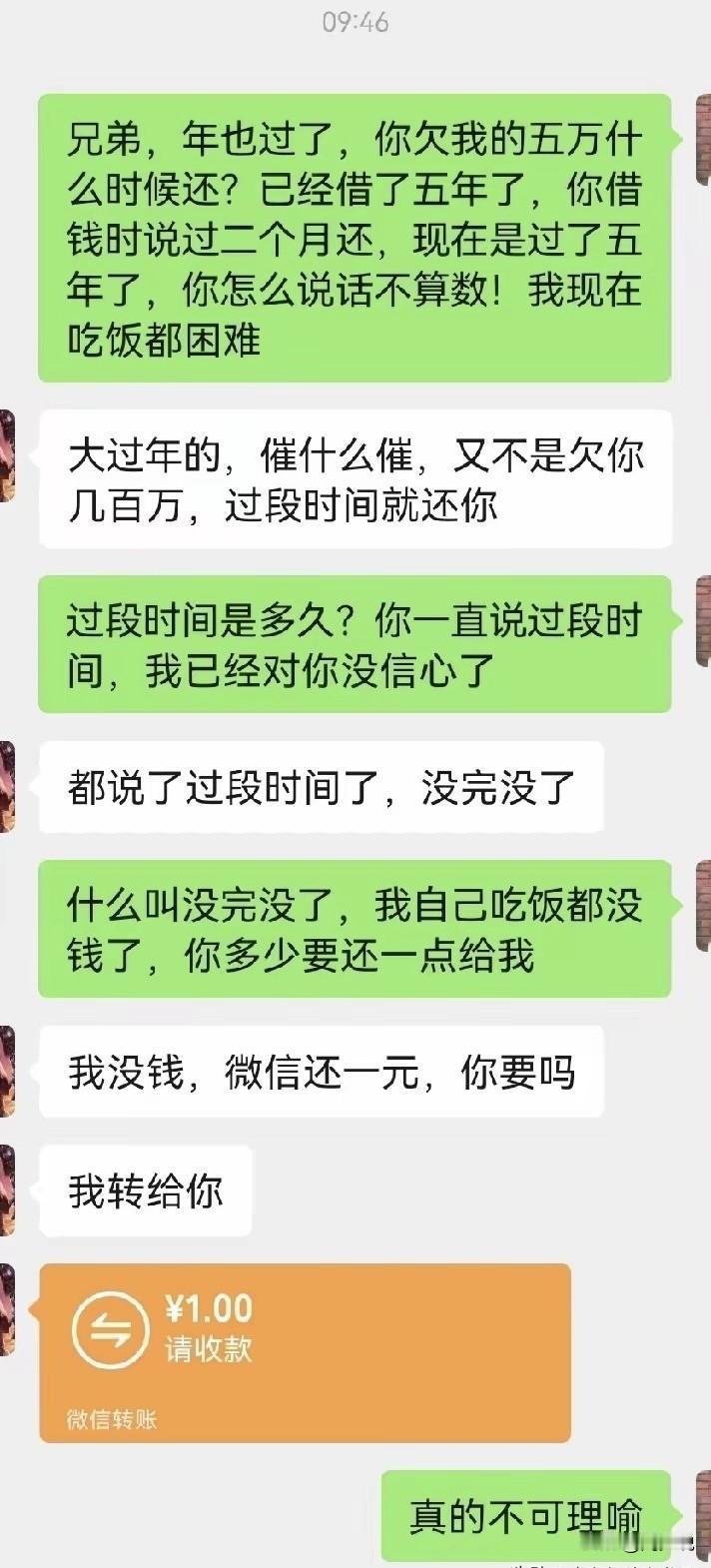 “兄弟,年也过了,你欠我的五万什么时候还?”近日,一段朋友间借钱不还的聊天记录刷屏网络,简单几句对话,道尽了借钱容易要钱难的心酸,也引发了网友们的热烈讨论。 借钱时承诺两个月就还,如今一晃五年过去,催债方早已生活拮据,连吃饭都成了难题。可欠债方不仅毫无愧疚,反而态度敷衍,一句“又不是欠几百万”满是不在乎,最后甚至只肯转一元钱,还指责对方“不可理喻”,冷漠的态度让人心寒。 针对此情况,有网友直言:“真心帮人,最后反倒成了仇人,这钱借得太不值了”。 也有人感慨:“别轻易借钱给别人,再好的关系,沾上钱也容易变味”。 在周少看来,其实这件事,远不止是一场债务纠纷那么简单。它狠狠撕开了人情社会里最现实的一面:信任,是人与人之间最珍贵的东西,却也是最经不起消耗的东西。当初出手相助,是念及兄弟情分,可一次次的拖延、敷衍,把这份情谊磨得一干二净。 我们总说谈钱伤感情,可真正伤感情的,从来不是钱,而是不守信用、不懂感恩的人心。借钱本是雪中送炭,不该变成日后的针锋相对。 总之,守住诚信的底线,懂得知恩图报,才是为人处世最基本的准则。别让一次失信,毁掉积攒多年的情谊;也别让透支信任,成为自己人生路上的绊脚石。#寻美三湘# #周少说教育#