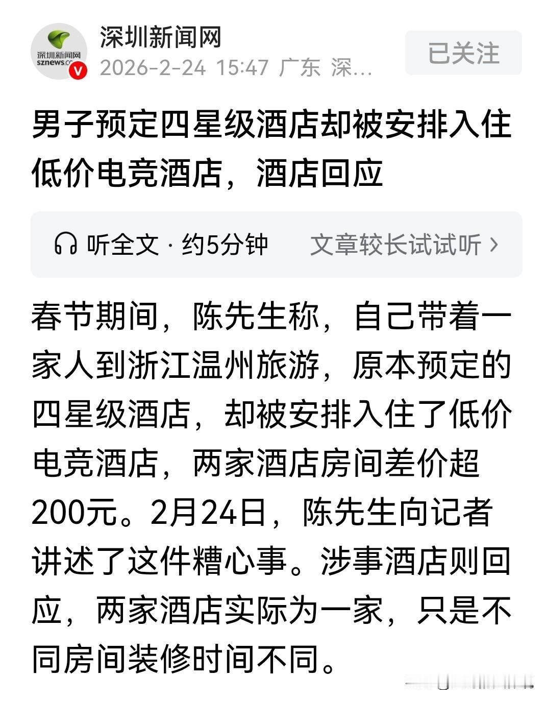 这就是欺诈!浙江温州,男子在春节假期带家人到温州游玩,花1174元预定了3间精致大床房。因为人多,他又下单了一个电竞酒店房间,价格186块一晚。办理入住手续时,却意外发现,新订的电竞酒店房间,就在他预定的四星级酒店房间的隔壁,而两个房间的格局、家具、摆设一模一样,洗漱用品的包装袋上印的也是同一家酒店的logo,男子这才反应过来,他花390元预订的酒店,实际住进去的是186块一晚的电竞酒店。男子气炸,反馈后,酒店竟拒绝退款。 春节假期还有几天,陈先生带着一家人出门旅游。 想趁着假期尾声人少点,能好好玩两天。 他提前在网上订了酒店,选的是温州东某大酒店,平台上面标注,是四星级。 为此他还特意翻了翻住客评价,看着都还行,就订了3间精致双床房,一共花了1174块钱,合390多一间。 2月21号那天,他们到达了酒店。 办入住的时候,手机里收到的短信还写着“东某大酒店”,一切看起来都很正常。 陈先生把家里人安顿好后,同屋的亲戚说怕吵,休息不好。 他就想着亲戚不常出来玩,休息不好影响第2天的行程,不如干脆再多开一间房。 他打开去哪儿网随便翻了翻,看到同一栋楼里还有个穿越电竞酒店。 价格便宜不少,才186块一晚,就顺手下了单。 在安排自己一家老小住下后,他去办这第二间房的入住手续。 却意外发现了酒店的猫腻,他新订的电竞酒店房间,就在刚才住下的东某大酒店房进去看了看,两个房间的格局、家具、摆设,几乎一模一样。 他仔细翻了翻房间里的东西,发现洗漱用品的包装袋上印的是“东某大酒店”的Logo。 但旁边放着的置物盒,却明明白白写着“电竞酒店”。 陈先生这才反应过来,他花390多块订的四星级酒店,实际住进去的,是那家186块一晚的电竞酒店。 他当时就觉得这事有点离谱。 两家酒店房间的差价超过200块钱。 平台上东某大酒店标的是四星级酒店。 而电竞酒店是经济型,结果住进去的却是同一类型的房间。 他找到酒店前台打听到底是啥情况,工作人员回复他说,这两家酒店其实是一家,老板夜是同一个人。 至于为什么给他安排便宜的房间,工作人员说酒店房间紧张,正常操作。 陈先生后来自己查了一下。他在信息里看到,东某大酒店的股东,是温州某建设集团。 电竞酒店是2023年开的,股东是自然人,两家在公开信息里没什么关联。 平台上标注的也不一样,一家是四星级,一家经济型。 他又看了看价格,拿2月24号来说,东某大酒店的精致双床房是232块一晚。 电竞酒店的单人房是180块一晚,差价还是摆在那。 陈先生后来又联系了酒店,这回工作人员说得更直接一些。 对方告诉他,电竞酒店和东某大酒店,确实是同一个老板。 五楼和六楼的房间属于价格低的那部分,两边共用。 2025年新装修的房间,就是东某大酒店的,价格高; 没装修的就是电竞酒店的,价格低。 如果东某大酒店的房型紧张,确实有可能会安排客人住到电竞酒店那边去。 工作人员还跟他说,可以让他退掉网上订的房,在线下重新订,但陈先生并没接受。 事后,陈先生却越想越气。 要不是自己多订了一间电竞酒店的房间,压根发现不了这个问题。 平台上审核不严,酒店又这么操作,他觉得这不是什么误会,就是明摆着欺骗顾客。 订酒店平台的客服,后来联系陈先生。 客服说,酒店那边反馈,两家酒店的星级和房间是一样的,平台可以补偿他600块钱。 但陈先生没同意,他在平台上发了个评价,想把自己的经历写出来提醒别人,结果审核没通过。 2月24号,平台客服又给他打了个电话。 对方说,虽然酒店方面不肯退款,但考虑到是在他们平台订的,平台可以全额退款,24小时内到账。 陈先生已经把这事反映给了温州市12315。 他说,自己也不是非要那点钱,就是觉得这事太气人了。 带着一家人出来玩,订酒店的时候特意选了四星,想着住得舒服点,结果被安排到一个便宜的电竞酒店房间。 差价200多块,而酒店却还说这是正常操作。 他想知道,四星级和经济型酒店,到底是怎么变成“同一家”的? 《消费者权益保护法》第55条第1款:经营者提供商品或者服务有欺诈行为的,应当按照消费者的要求增加赔偿其受到的损失,增加赔偿的金额为消费者购买商品的价款或者接受服务的费用的三倍。 在日常生活中,消费者往往处于信息不对称的弱势地位。 商家如果故意欺骗消费者,会让消费者遭受经济损失和不良体验。 本案中,酒店将经济型的电竞酒店房间,以四星级酒店房间的价格,提供给陈先生,属于典型的欺诈行为。 陈先生按照四星级酒店的标准支付了房费,期望获得相应品质的服务。 但实际入住的却是低价的电竞酒店房间,酒店这种行为违背了陈先生的真实意愿,给他造成了经济损失和心理上的不满。 因此,陈先生有权要求酒店按照他支付房费的三倍进行赔偿。 对此你怎么看?