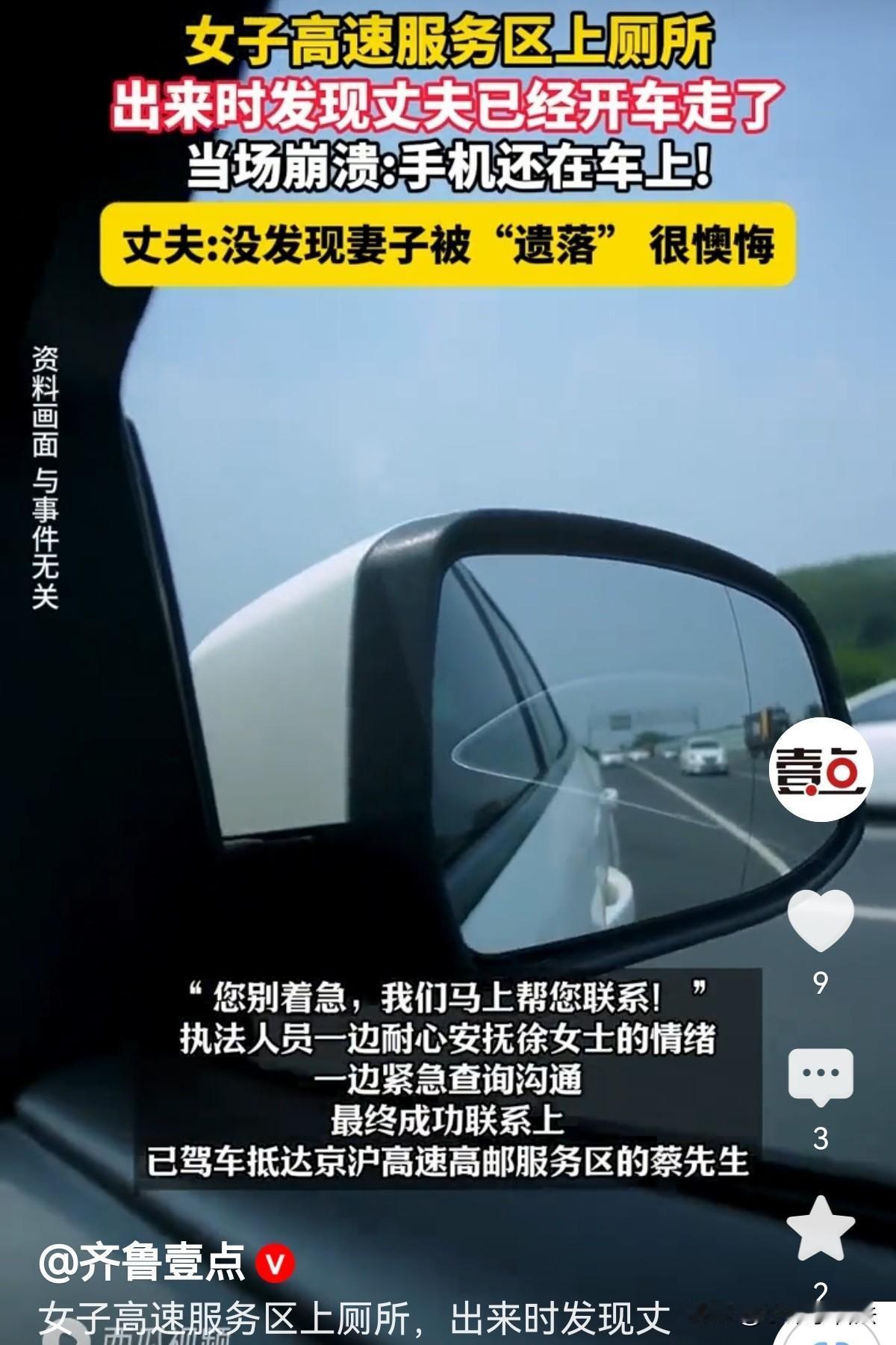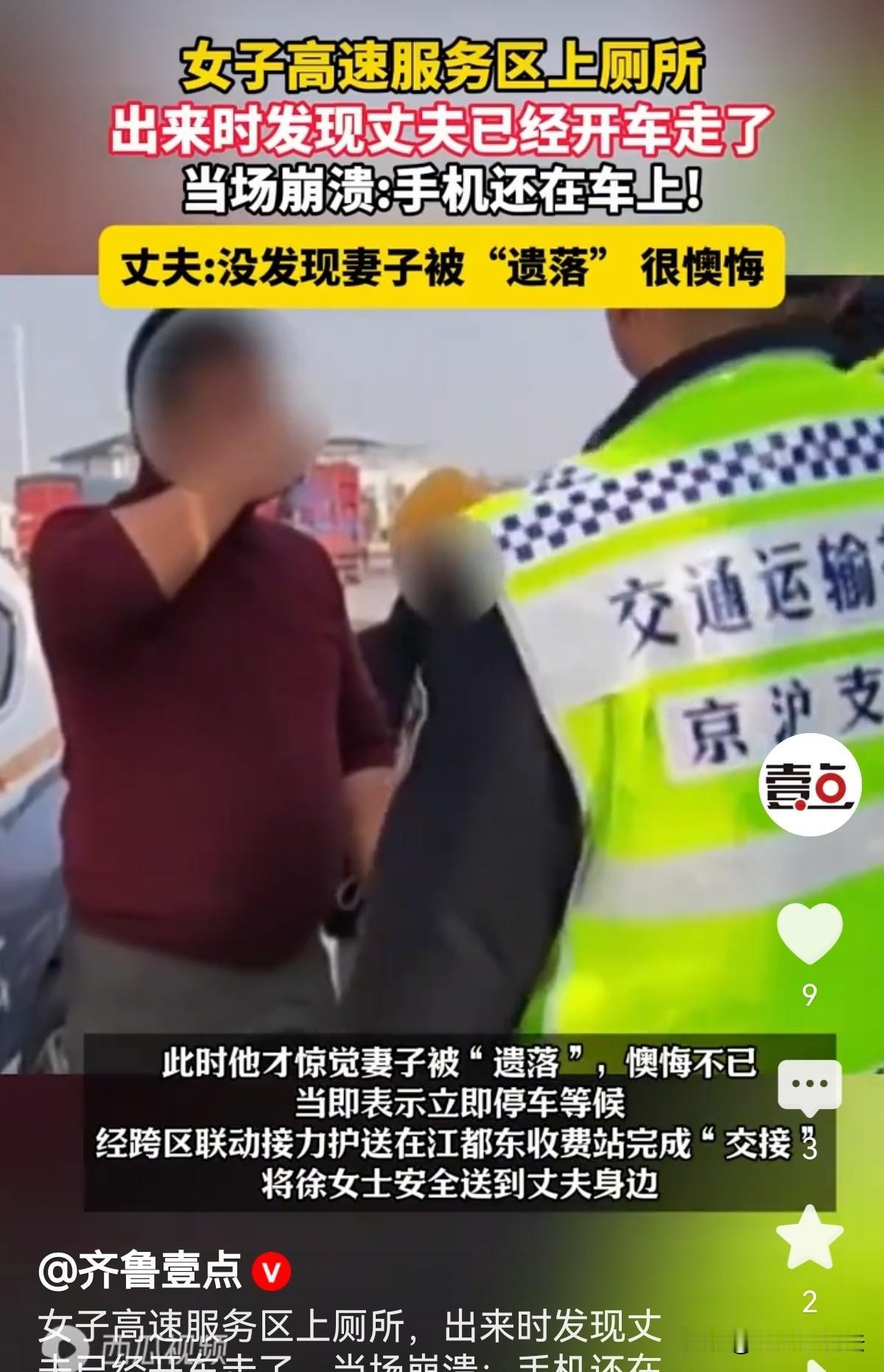 这心真大啊!扬州广陵,春运返程期间,女子与丈夫驾驶货车在服务区暂时休息,她下车上厕所,等她返回时丈夫已驾车驶离。女子崩溃大哭:手机还在车里!她无奈求助执法人员。执法人员紧急联系已开到数十公里外的丈夫,对方才惊觉妻子被落下。随后执法人员启动跨区联动,接力护送,最终将女子安全送回丈夫身边,夫妻重逢后连连致谢!网友:能把媳妇丢下的男人还能要吗? 春运返程的高速路上,车流如同一条望不到头的长龙,扬州广陵服务区内车水马龙,人声鼎沸,到处都是匆忙赶路的车辆和行人,满是奔波的忙碌气息。 谁也不曾想到,在这人潮拥挤的服务区里,一场令人哭笑不得又暖心十足的小意外,悄然上演。 徐女士与丈夫蔡先生驾驶着上海牌照的重型厢式货车,奔波在春运返程途中。 长途驾驶让两人都疲惫不堪,商议后决定在广陵服务区短暂停靠休整。 蔡先生连续开车许久,浑身酸痛,打算趁着停车的间隙好好休息片刻。 徐女士一路憋尿难耐,她看特意看了一眼闭目养神的丈夫,没忍心打扰他休息,想着快去快回,便快步推开车门,朝着卫生间的方向走去。 当时服务区内货车密集、人来人往,徐女士匆匆走进卫生间,满心只想着尽快解决问题,回到车上继续赶路。 可短短几分钟的功夫,意外突然发生。 等徐女士洗好手,急匆匆跑回停车位置时,整个人瞬间僵在原地,自家大货车,早已不见踪影。 徐女士当场大脑一片空白,愣了许久才反应过来:丈夫竟然把她落下,独自开车离开了! 更让她绝望的是,手机、钱包全都放在车上,下车时她只带了一个小包,身无分文、没有任何通讯工具,在这个陌生的服务区里,她彻底陷入了求助无门的境地。 春运期间的服务区人员繁杂,孤身一人的徐女士看着来来往往的陌生人,想到自己被独自遗落,丈夫早已驾车远去,无助与委屈瞬间涌上心头。 她控制不住地崩溃大哭,蹲在地上手足无措,又急又怕,眼泪止不住地往下流。 就在徐女士孤立无援时,正在服务区执勤的执法人员,发现了情绪失控的她。 看到徐女士哭得浑身发抖,执法人员立刻上前,轻声细语地询问情况。 徐女士抽抽搭搭地诉说了遭遇:上厕所的功夫车就没了,手机还在车上,根本联系不上丈夫。 执法人员一边暖心安抚,让她不要慌张,一边立刻展开行动。 春运期间高速车流量极大,寻找一辆驶离的货车难度不小,但执法人员丝毫没有耽搁,通过系统查询、多方联动,终于成功联系上了徐女士的丈夫蔡先生。 此时的蔡先生,已经驾车驶出几十公里,抵达了京沪高速高邮服务区。 接到执法人员电话的那一刻,他猛地一拍脑袋,惊觉自己犯下大错。 他一直以为妻子在车内后排休息,完全没注意到她下车去了卫生间,休整后便直接驾车驶离。 得知自己把妻子独自遗落在服务区,蔡先生又愧疚又懊悔,不停自责自己的粗心大意,当即表示会立刻停车等候,绝不随意移动。 考虑到让徐女士独自前往会合不仅路途遥远,还存在极大安全隐患,宁沪支队第二大队当即启动跨区联动机制,第一时间对接京沪支队第三大队,一场暖心的高速团圆接力就此展开。 执法人员带着徐女士从广陵服务区出发,一路护送至江都东收费站,与早已在此等候的京沪支队第三大队执法人员完成无缝交接。 最终,在两队执法人员的接力护送下,徐女士平安回到了丈夫身边。 见到妻子的那一刻,蔡先生快步上前,紧紧拉住她的手,不停道歉,满脸自责。 徐女士所有的委屈与害怕也在重逢的瞬间烟消云散。 夫妻二人对着执法人员连连鞠躬,不停地表达感谢。 执法人员在欣慰之余,也现场叮嘱蔡先生,春运长途行车务必细心谨慎,出发前一定要清点随车人员,避免此类疏忽再次发生。 这场春运路上的小乌龙,因执法人员的暖心相助,最终圆满解决。 这也提醒着所有返程的驾驶人,行车在外多一分细心,就多十分安全,千万不要因为一时大意,把最亲近的人遗落在路上。 有人说,两个人都坐在驾驶室都能把媳妇忘了纯粹的是故意的! 有人说,现实版"丢三落四"?夫妻开车竟把妻子落在服务区,简直匪夷所思! 还有人说,这位丈夫也真粗心,估计到家也会被媳妇骂的头破血流,非得让他跪搓衣板! 可以在服务区跟人说下原因,借别人电话给自己丈夫打下,回头来接自己不就完美了吗?耗费警力! 对此您怎么看?
