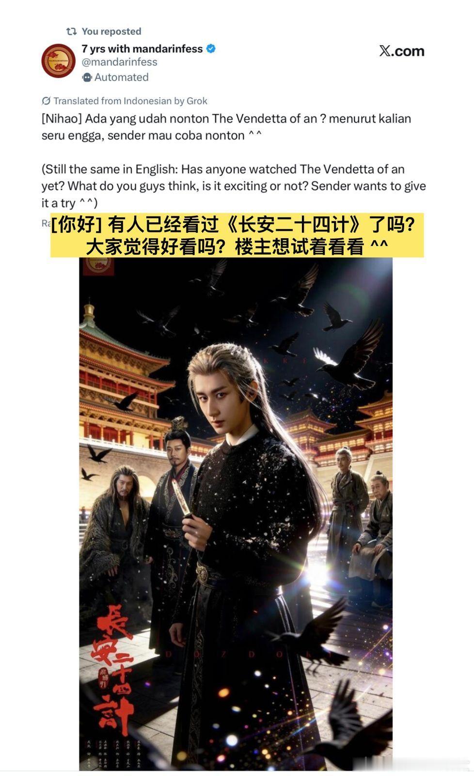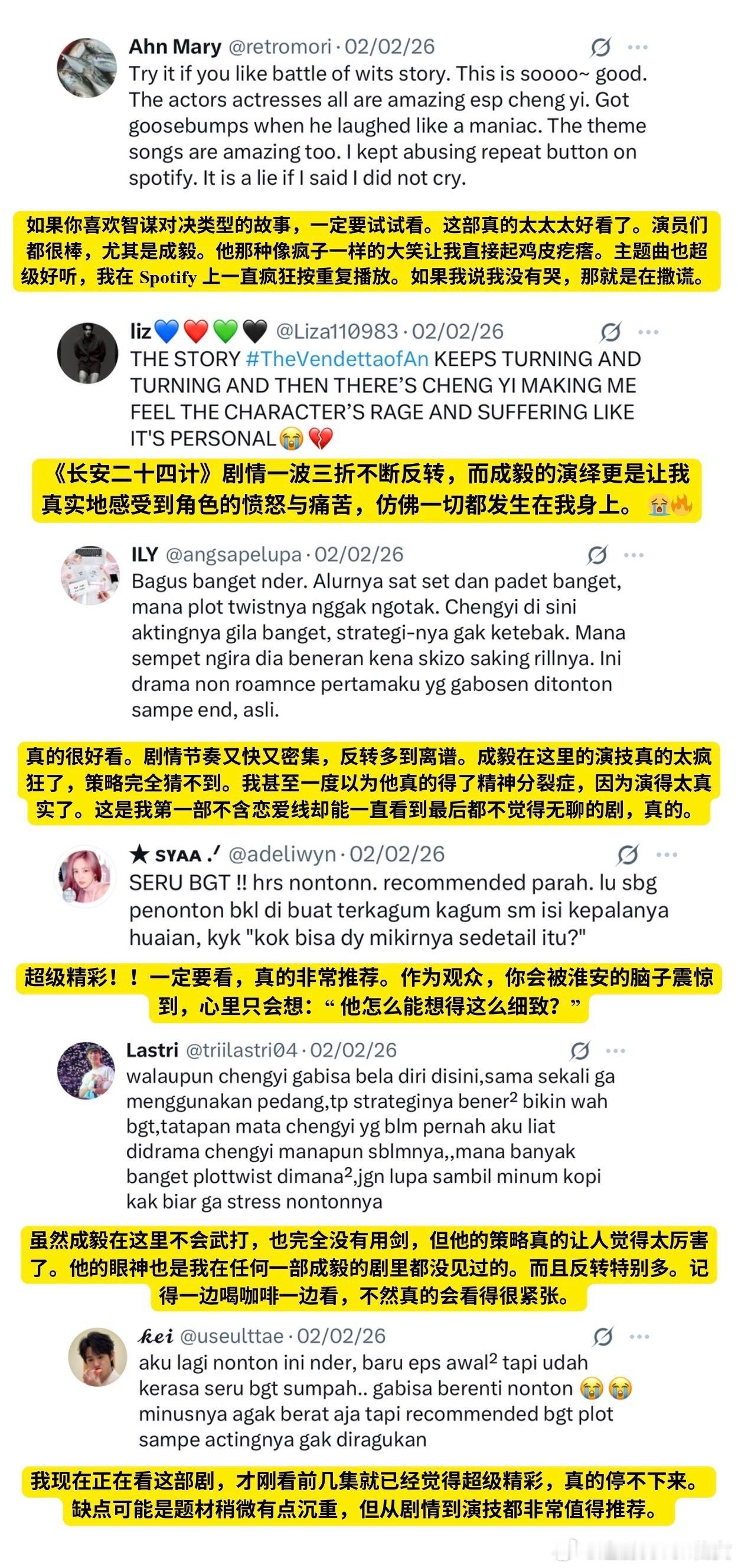 印尼X 平台的关于《长安二十四计》的观后评价,观众都夸这部剧剧情的发展和制作质量非常高,尤其是成毅饰演的谢淮安,获得了大量赞赏,印尼网友夸他的演技细腻有层次,极具张力的表演是这部剧的大亮点,不仅打动了粉丝,也让原本不了解他的印尼观众,都被他的实力圈粉,看过的观众都给予很高的评价。果然好演员无国界,海内外的观众审美都是一致的
