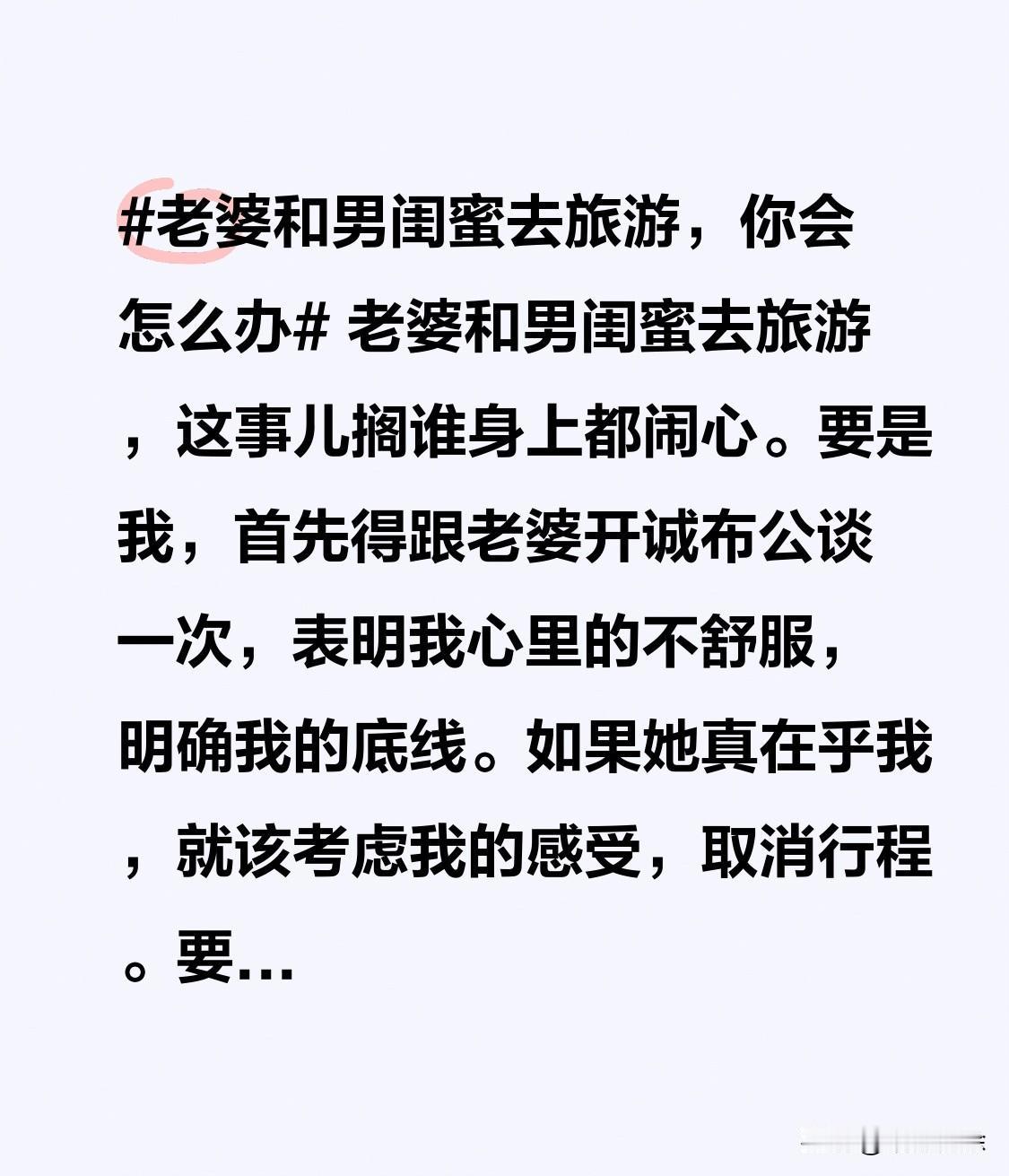 老婆和男闺蜜去旅游,这事儿搁谁身上都闹心。要是我,首先得跟老婆开诚布公谈一次,表明我心里的不舒服,明确我的底线。 如果她真在乎我,就该考虑我的感受,取消行程。要是她执意要去,那我也得留个心眼,多关注她的动态。毕竟,有些界限还是得守着,不能让这所谓的“男闺蜜”越了界。