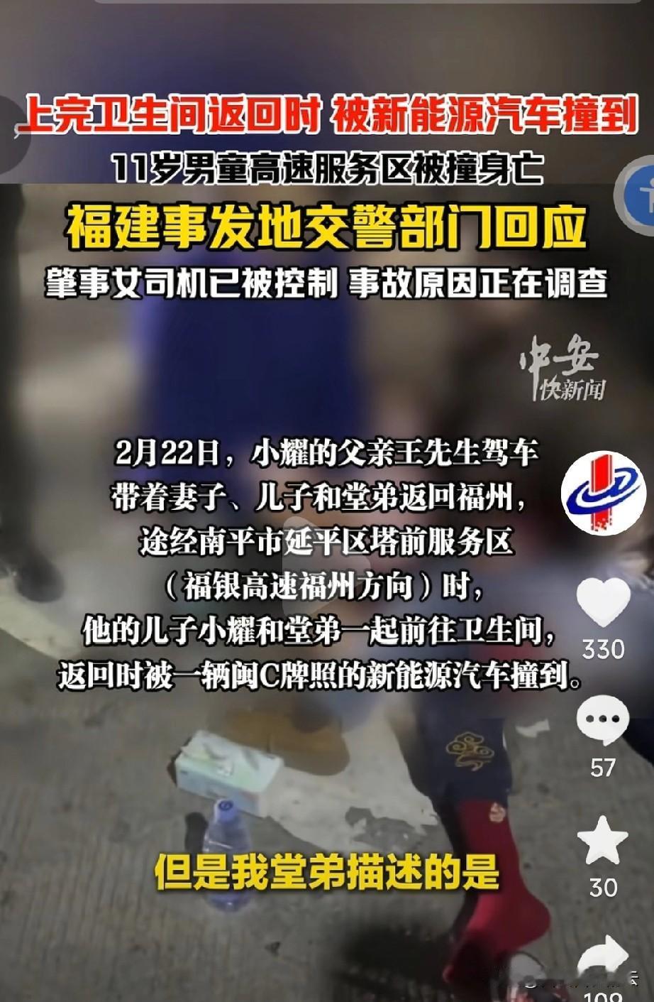 看着爸爸不停搓着儿子的手,想给他找回温度的时候,真的好想哭。这是2月22日发生在福建南平服务区的一场车祸。 当时11岁的男孩跟叔叔一起去上卫生间,回来的时候他被叔叔牵着走在斑马线上,突然被一辆新能源汽车加速撞倒,这辆车还二次加速撞击他们。 发生车祸后,男孩家人打了120,但是因为堵车救护车一小时后才到,男孩没抢救过来,叔叔还在医院治疗。 肇事司机是个女子,她也害怕了,一个劲的道歉,说是因为自己太紧张,撞到后又踩了加速。男孩的叔叔说,当时他们前面不远处有人,他们又在斑马线上,一直陆陆续续有人走,根本不存在视野盲区,不知司机为什么突然加速。 唉,本来一家人高高兴兴从老家回家的,儿子却没了。孩子爸爸说他这几天一直睡不好觉,头脑里都是儿子被撞倒的样子。太可怜了。 现在事故还在调查中。我觉得有些人,如果不适合开车就不要开了吧,出事了可就晚了,害人害己。 对于这件事,你怎么看呢?