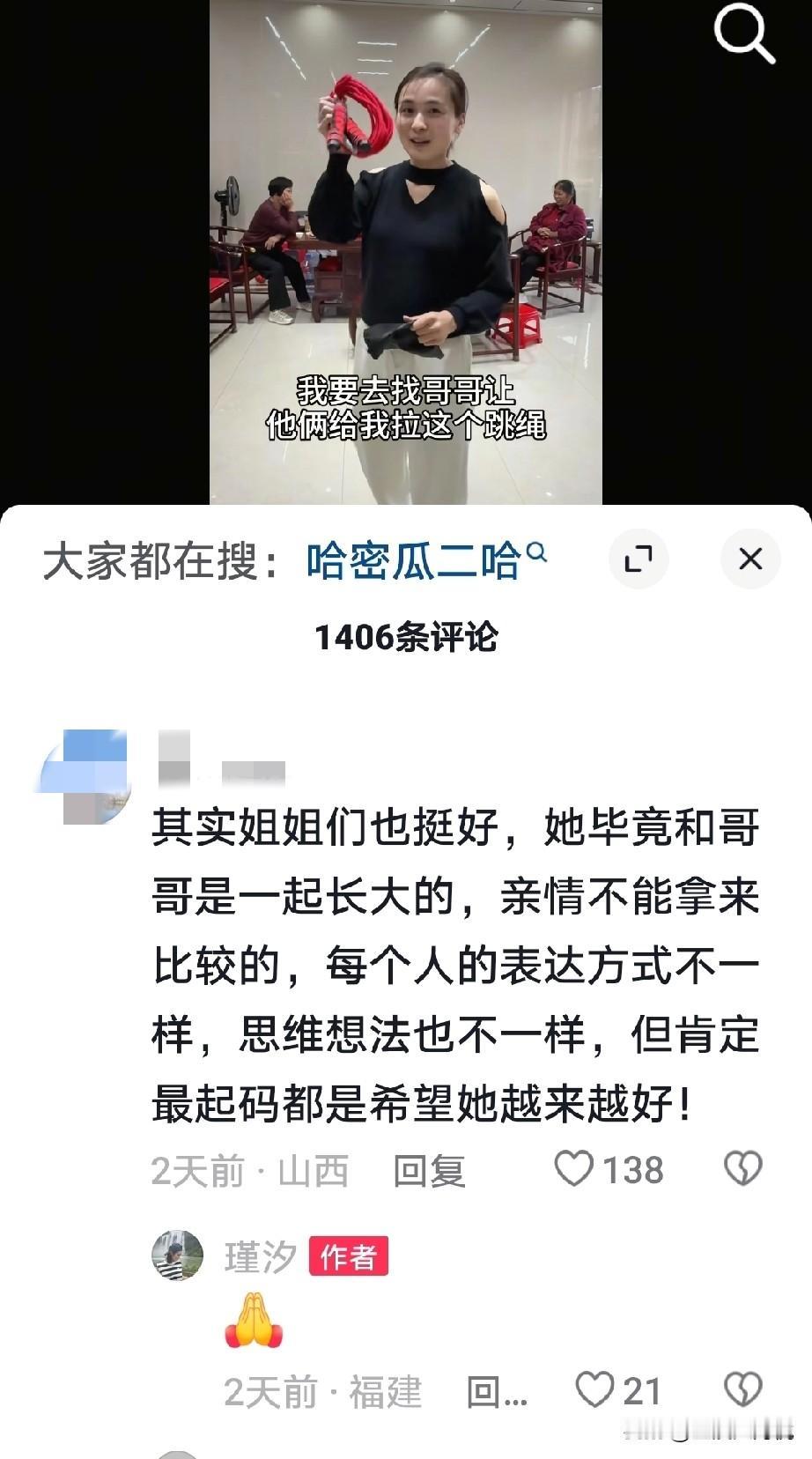 网友说:其实姐姐们也挺好,她毕竟和哥哥是一起长大的,亲情不能拿来比较的,每个人的表达方式不一样,思维想法也不一样,但肯定最起码都是希望她越来越好! 确实是这样的,一边是从小一起长大的哥哥,一边却有血缘但是从小到大都没有在一起过,也不知道对方的存在, 怎么可能都一样的呢? 38年的空缺都是空白的,一时间也是无法弥补回来。 要是换作我也不可能和虽然有血缘但是38年没有在一起过亲的, 怎么相处都会有隔阂的,别别扭扭的, 大家怎么说呢?