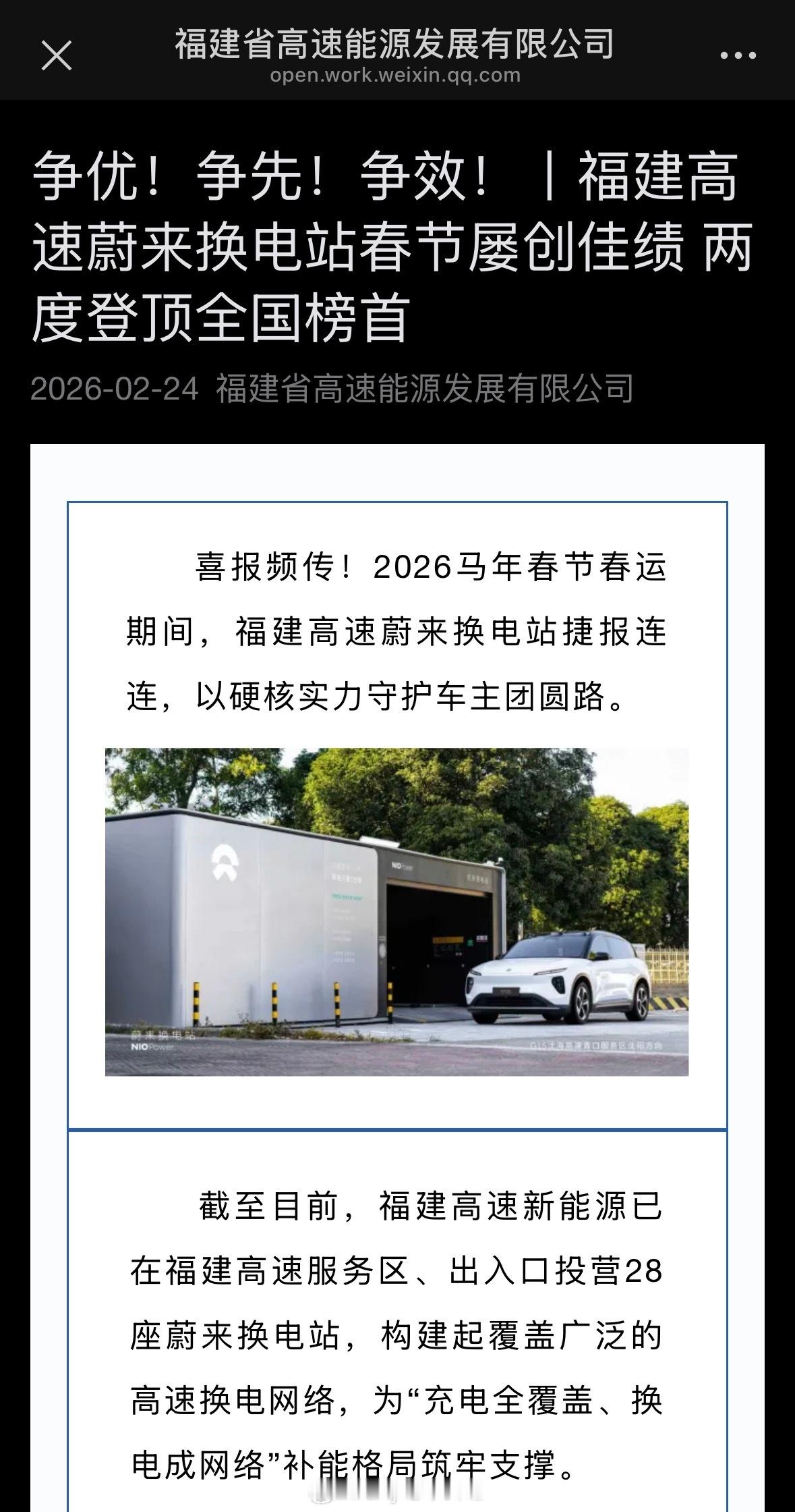 这是一则福建省高速公号对蔚来换电站服务能力的评价:硬核实力守护车主团圆路。