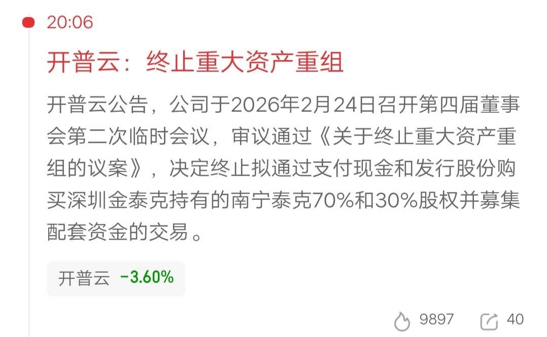 IT服务板块最惨的票诞生了,高位腰斩后又出利空,八千多股东倒大霉了。 开普云的这波主跌浪,非常惨烈呀。短短十四个交易日,跌幅接近50%。高位接盘的资金,一万只剩五千了。 今天盘后一则消息,让持有的散户心里拔凉呀。公司公告,终止重大资产重组。利好没了,那就是利空。 再看业绩数据,妥妥的绩差股。营收只有2.3亿,利润亏损361万。 利润亏不会问题,但是营收少问题就大了。因为营收是衡量公司市场占有率的指标,站不稳脚跟,就容易被淘汰呀。 开普云的股价走势,很有力的说明,为什么散户很难在市场赚钱。上涨的时候都很曲折,很难拿得住。但是跌起来会很犀利,犹豫一下就被套了。大部分散户被套都是躺平的,结果就是越套越深。 所以大家选票一定要严格,仓位一定要控制好,才不会遭遇灭顶之灾。