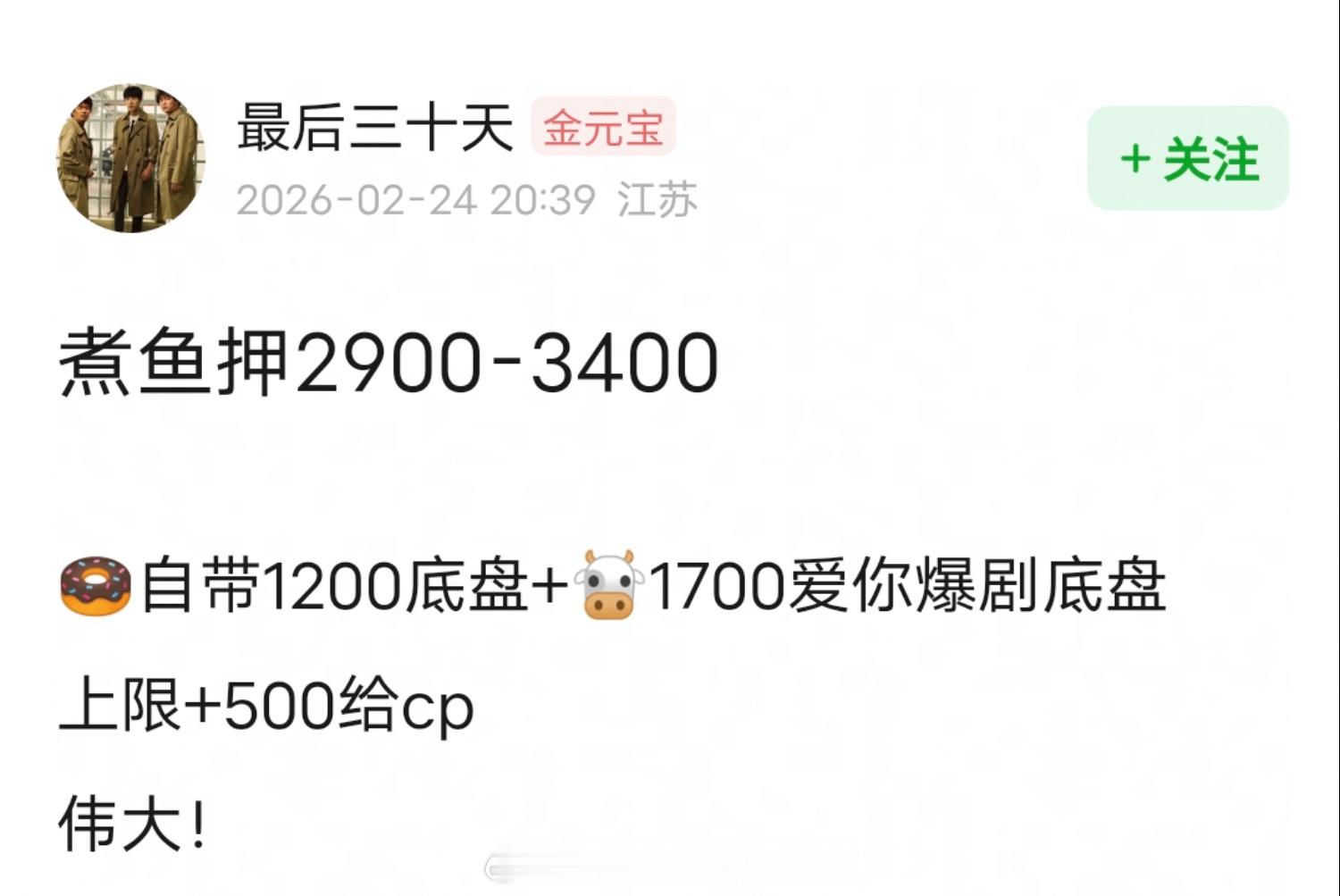 网友预测《逐玉》云合集均在2900-3400田曦薇自带1200底盘,张凌赫1700《爱你》爆剧底盘,cp加成上限500+