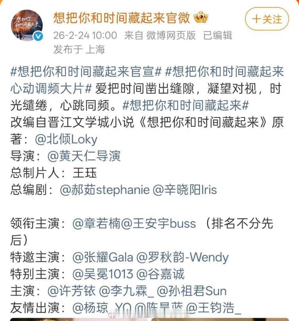 平番即双主演,能看到章若楠和王安宇这种颜霸组合搭戏才是赚到了吧!新剧刚开机,不如多关注下这对 CP 的对手戏!两方合作才是双强共赢!想把你和时间藏起来