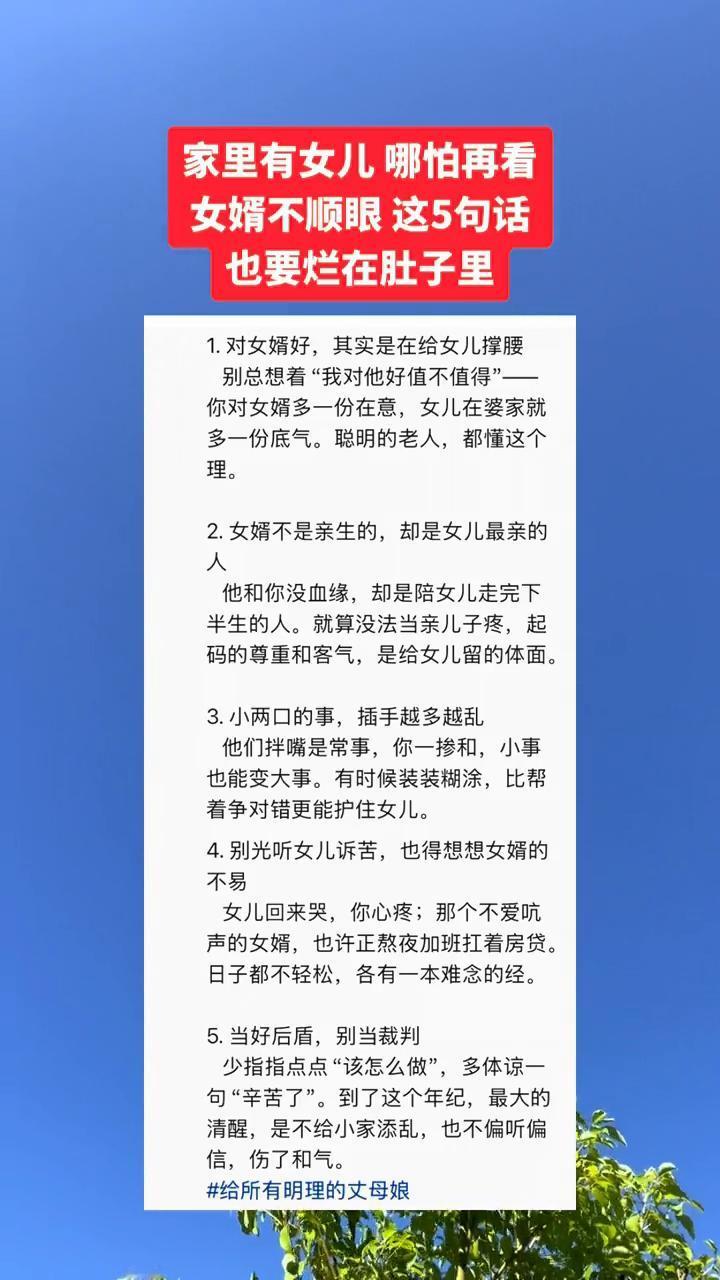 家里有女儿哪怕再看女婿不顺眼,这5句话也要烂在肚子里。 ·1.对女婿好,其实是在给女儿撑腰。别总想着"我对他好值不值得",你对女婿多一份在意,女儿在婆家就多一份底气。聪明的老人都懂这个理。 ·2.女婿不是亲生的,却是女儿最亲的。他和你没血缘,却是陪女儿走完下半生的人。就算没法当亲儿子疼,起码的尊重和客气是给女儿留的体面。 ·3.小两口的事插手越多越乱。他们拌嘴是常事,你一掺和,小事也能变大事。有时候装装糊涂,比帮着争对错更能护住女儿。 ·4.别光听女儿诉苦,也得想想女婿的不易。女儿回来哭,你心疼;那个不爱吭声的女婿也许正熬夜加班扛着房贷。日子都不轻松,各有一本难念的经。 ·5.当好后盾,别当裁判。少指指点点"该怎么做",多体谅一句"辛苦了"。到了这个年纪,最大的清醒是不给小家添乱,也不偏听偏信,伤了和气。 给所有明理的丈母娘。