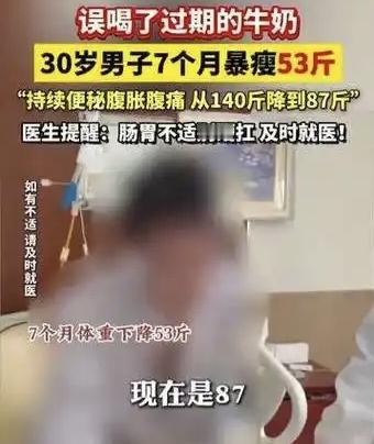 太吓人了! 30岁男子误喝过期牛奶,7个月从140斤暴瘦到87斤,这个事儿听着都吓人。 这兄弟当初就是喝了瓶过期牛奶,当时没在意,结果肠道损伤不可逆,吃什么拉什么,人瘦得脱了相。很多网友还纳闷,喝个过期奶至于吗?其实真至于——变质食品里的细菌毒素,碰上身体弱的时候,能把整个消化系统搞垮。 教训就两条:一是过期的东西别心疼直接扔,省那几块钱不够去医院塞牙缝;二是拉肚子超过三天赶紧就医,别硬扛。 一个大男人半年瘦掉53斤,这不是减肥是减命啊。过期 牛奶过期
