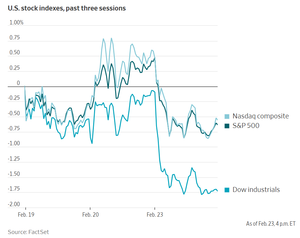 2月23日,投资者还纷纷将资金转向能源、必需消费品等板块,但这些行业在主要股指中的权重相对较低。投资机构表示,上述防御性资产愈发受捧,或表明华尔街对后市前景愈发谨慎。