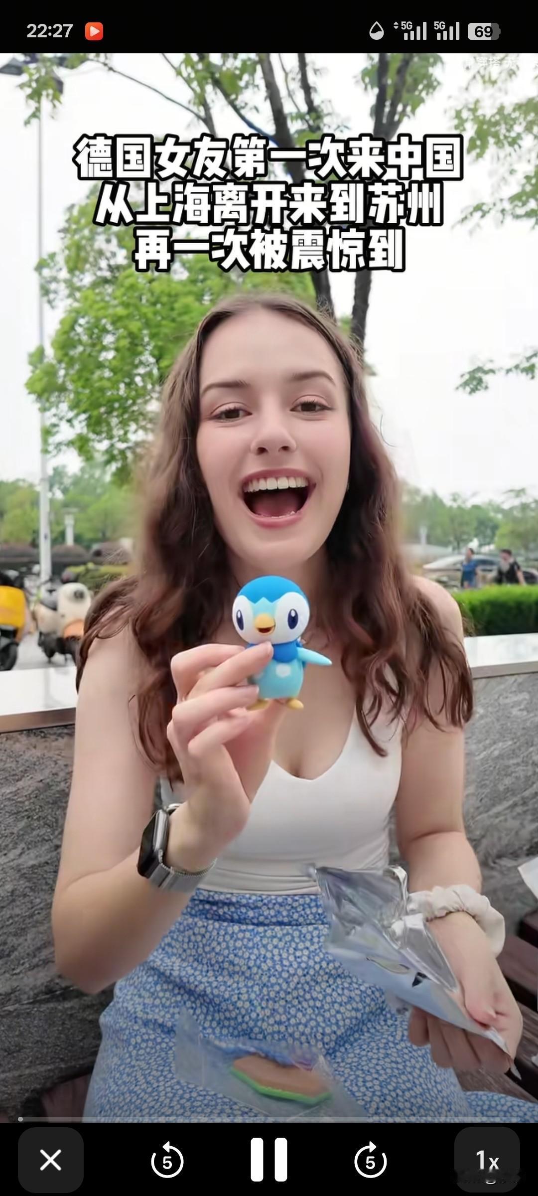 中国男子第一次带德国女友来中国旅行, 带她在上海玩了一天, 随后又带他来到了苏州, 她被这里的美景征服了, 请她吃了个中餐, 她特别喜欢吃冰粉, 尤其是草莓冰粉, 酸酸甜甜的, 她说这个味道是她的最爱, 餐厅还免费给她了一杯热水, 这让她感觉非常震惊, 毕竟在国外这是需要1欧元的, 在中国餐厅居然是免费的, 吃完饭和他们逛了商场, 发现了有趣的盲盒, 中国男友给她买了一个礼物, 还表示可以给她的妹妹一个礼物, 这让德国美女觉得很幸福, 还说她是最幸福的中国媳妇儿, 这就是德国女孩, 一个乐观开朗的小老外!
