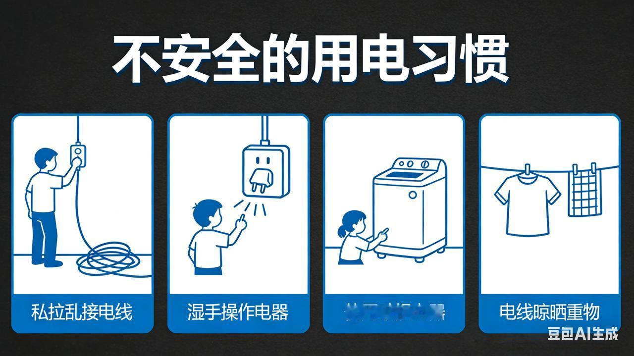一、最常见的危险习惯 充电器“空载”:手机、充电宝等充完电只拔设备不拔插头。充电器持续发热,不仅耗电、加速器件老化,还容易因短路或故障引发火灾。 私拉乱接电线:为图方便,用插线板“一线到户”,或直接将多根电线拧在一起。这样极易造成接触不良、发热起火,若使用非标电线风险更高。 插座“小马拉大车”:在一个插座上同时接空调、电暖器等大功率电器。超负荷运行会让线路急剧发热,最终烧毁绝缘层导致短路。 二、电器使用误区 湿手碰电器:手湿时直接拔插头或触碰开关,极易导致触电,尤其是在浴室。 忽视老化破损:发现电线破皮、插头变黑或松动时,觉得还能用就用胶带缠一下。这会导致漏电、短路,甚至引燃周围可燃物。 电器积灰:电视机、电脑等电器背部灰尘堆积过厚,湿润天气下容易形成导电通道,损坏电路或引发跳火。 “长待机”不断电:路由器、机顶盒等从不切断电源,长期处于通电发热状态,会加速元件老化,增加火灾风险。 三、充电安全盲区 电动车进楼充电:这是严重的高危行为。锂电池一旦热失控,燃烧极快且会产生剧毒浓烟,极易堵塞逃生通道。 整夜过度充电:很多劣质充电器缺乏过充保护,长时间充电会让电池持续发热,加速老化,甚至引发热失控。 床上充电:将插线板或充电器放在床上给手机充电。棉织物是易燃品,且不利于散热,容易引发火灾。 四、容易被忽略的细节 用金属物捅插座:家里有小孩时,要确保插座有保护门,教育孩子不能用手指或金属物去捅。 插座“头重脚轻”:大而重的插头如果悬空挂在插座上,长期会导致插座内部金属弹片松动,造成接触不良、发热。 在电暖气上烤衣服:这会严重阻碍散热,引燃衣物的风险极高。 建议看到我这篇文章的朋友们对家里做个“用电安全检查”,及时纠正这些习惯。如果遇到电器冒烟、起火,记得先断电,再灭火(使用干粉或二氧化碳灭火器,绝不能用水),并立即联系专业电工或报警。