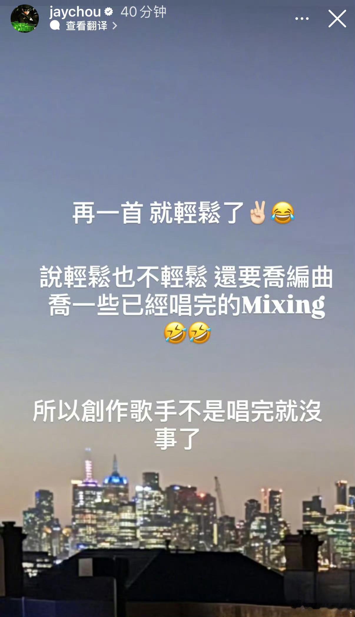 周杰伦说新专辑再一首就轻松了周杰伦说创作歌手不是唱完就没事了周杰伦昨晚更新动态,透露新专辑“再一首就轻松了”,不过紧接着又补了一句:说轻松也不轻松,还要定编曲、混音,“所以创作歌手不是唱完就没事了。”看来离听到新歌真的不远了,搓手期待!