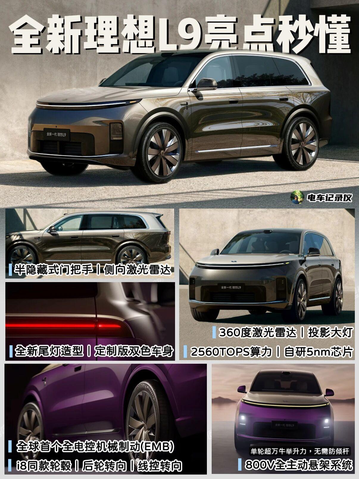 1️⃣车身定位与尺寸 👉🏻新车命名为L9 Livis,定位全尺寸旗舰SUV,售价55.98万,直接问界M9和极氪9X。新车进一步加长,呈现出短车头、长后悬的顶级SUV车身姿态。 👉🏻现款L9定位为大型SUV,售价为40.98-43.98万元,对位问界M8和蔚来ES8等车型。 2️⃣外观设计 👉🏻新车整体框架延续现款车型,前脸进气格栅造型有细微调整,并换装投影大灯。此外,新款L9在开启智驾时,整条贯穿式日行灯都呈现蓝色,这和现款的小面积变蓝有所不同。 👉🏻侧面部分,新车采用双拼色车身+劳斯莱斯同款腰线,凸显出旗舰身份。同时换装了i8同款的7辐运动轮毂,门把手变为半隐藏式,算是提前适应明年的法规政策。 👉🏻车尾设计变化较大,改为纯平的贯穿尾灯,车身线条更加分明,整体显得更加简约和时尚,没有现款圆润中庸的感觉。 3️⃣智能化升级 👉🏻新款L9首搭理想自研的5nm智驾芯片,算力达2560TOPS,全球最强。并搭载了4颗激光雷达,可以覆盖全车360度。 👉🏻现款L9顶配搭载英伟达雷神芯片,算力为700TOPS。全系标配了一颗车顶激光雷达。 👉🏻理想的智驾能力本就在行业第一梯队,配合上这次硬件能力大升级,相信会有更出色的体验。 4️⃣底盘大升级 👉🏻新车搭载了800V全主动悬架系统,单个轮有超万牛的举升力,无需防倾杆,可以通过毫秒级瞬间反应,实现“反无力”的车身姿态。相信L9可以摆脱现款的“开船感”了。 👉🏻全新L9还升级了全线控底盘,包含了线控转向、后轮转向和全电控机械制动,大幅提升了新车的灵活性和驾控体验。 👉🏻现款L9搭载的是魔毯底盘,提供了双腔双阀空悬,虽说比初代L9的驾乘舒适性有了大幅提升,但新款的底盘是脱胎换骨般的大升级,相当期待实车的试驾体验。 5️⃣内饰方面 虽说目前没有内饰官图,但网络上有曝光的谍照。大概率改为纯电系列的设计语言,升级为电动空调出风口,以及全新的方向盘造型,并有可能取消方向盘上的迷你显示屏。 从升级的力度来看,全新L9给足了诚意,相信上市后会有不错的销量表现。旗舰SUV车型,你会选哪台呢?