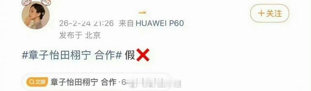 章子怡的对接专门出来辟谣章子怡跟田栩宁有合作一事了,但两个人莫名其妙互关了,也是