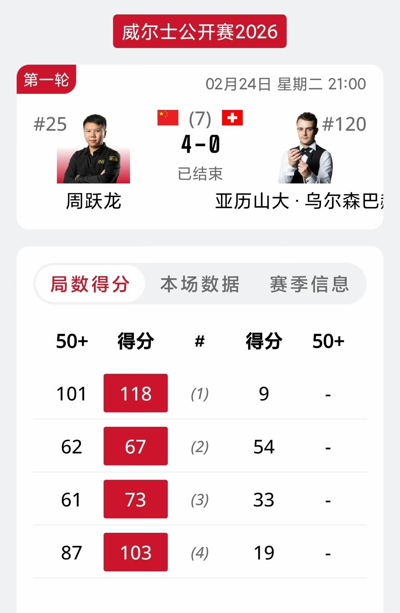 2026斯诺克威尔士公开赛64进32轮: 带着一丝疲惫,刚刚在球员锦标赛夺冠的赵心童还是4-3惊险击败范争一晋级32强。 周跃龙4-0零封乌森巴赫,本站只要夺冠就有希望获得15万英镑大奖。