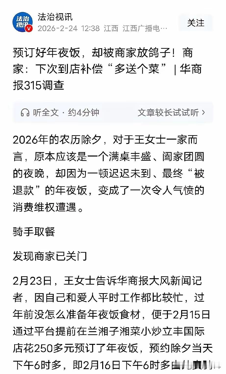 太糟心!女子花250多元预订了一桌年夜饭,不料,除夕当天她正在加班,突然接到骑手电话,说饭店已关门,无法取餐。让她更生气的是,饭店在大年初一偷偷把250多元退还给她,还赔偿60元代金券,还表示下次来吃饭送一个菜。女子无法接受,四处投诉,最终饭店作出妥协,但给出的解释却令人无语。 为了能在除夕这天省去繁琐的备菜、做饭流程,好好陪伴家人享受节日氛围,这位女士提前很久就在外卖平台上仔细挑选, 最终花费250多元下单了一整套搭配好的年夜饭套餐,菜品丰富,分量也刚好适合一家人食用,下单时平台和商家都显示订单确认有效, 并且承诺会在除夕当晚按时制作完成并安排配送,女士看着订单详情,安安心心等着除夕到来,满心都是对团圆饭的期待。 她怎么也不会想到,这份看似稳妥的预定,会在除夕当天彻底崩盘。除夕当天,她因为工作原因还在岗位上加班,原本计划着结束工作后就能回家,和等候的家人一起吃上热乎的年夜饭,全程不用操心饭菜问题,安安稳稳过节。 可就在傍晚家家户户开始飘出饭菜香的时候,她突然接到了外卖骑手打来的电话,骑手明确告知, 她下单年夜饭的店铺已经大门紧闭,店内空无一人,根本没有工作人员在制作餐食,也没有任何可以取餐的菜品,无法完成这单配送。 这个消息让女士当场愣住,加班的疲惫瞬间被慌乱取代,她怎么都无法理解,已经成功预定并且付款的年夜饭,商家怎么会在除夕当天直接关门停业。 她立刻放下手头的事情,反复拨打商家留在平台上的联系电话,从最初的急切拨打,到后来的一次次等待回音, 可电话那头始终是无人接听的状态,不管拨打多少次,都没有任何工作人员出面解释一句,仿佛这家店在除夕当天彻底消失了一样。 无奈之下,她只能紧急联系外卖平台的官方客服,希望能从平台处得到解决方案或是合理解释,可客服的回应同样让人失望,只是简单告知商家已经临时闭店,当天无法提供送餐服务, 对于为何没有提前通知消费者、订单失效后如何补救等关键问题,没有给出任何有效的安排,也没有主动提出帮助协调解决。 此时天色已经完全暗下来,除夕夜里大部分餐饮店铺都早已约满,甚至提前结束营业回家团圆,超市和菜市场也都关门休息,想要临时买菜做饭已经完全来不及。 女士只能在寒风里匆忙四处寻找还在营业的餐饮门店,顾不上菜品合不合适、够不够吃,只要能买到现成的食物就立刻下单, 等她带着简单的饭菜回到家时,家人们已经等候多时,原本精心期待的团圆年夜饭,最后只能靠着几份简单的外卖潦草解决, 一桌子菜没有年味,没有仪式感,一家人的心情都降到了最低点,好好的除夕夜被搅得一团糟。 更让她难以接受的是,从年夜饭泡汤、一家人潦草过节,再到她满心委屈无处诉说,商家始终没有主动联系过她,没有一句道歉,没有一个解释,仿佛完全忘记了这张订单的存在。 直到大年初一,春节的第二天,她才突然收到退款提醒,商家在没有任何告知的情况下,悄悄将250多元的餐费原路退回,除此之外还额外发放了一张60元的代金券,附带一句简单的说明,表示下次到店消费可以免费赠送一道菜。 这样敷衍的处理方式,彻底点燃了女士的不满,在她看来,除夕夜的团圆饭是一年中最重要的一餐, 被商家无故爽约带来的糟糕体验,根本不是退款、代金券和送菜就能弥补的,商家全程毫无责任心,出了问题不沟通、不道歉,只用最简单的方式草草了事,完全没有尊重消费者。 她不愿意接受这样的处理结果,开始通过平台投诉、消费者维权渠道等多种方式反映问题,坚持要一个真诚的道歉和合理的解决方案。 在她持续的沟通和投诉下,商家终于不再保持冷漠,被迫做出了妥协,调整了原本的补偿方式,可即便如此,商家后续给出的解释依旧让人觉得无语, 全程没有正视自己临时闭店、未通知消费者的严重失误,也没有表达出真正的歉意,更多是迫于投诉压力才做出让步,没有从根本上认识到自己的问题。 一顿本该温暖的年夜饭,变成了一场充满糟心与无奈的纠纷,从除夕当晚的无助与失望,到节后维权的疲惫与心累,这位女士的春节假期,完全被商家的不负责任打乱,也让身边不少人开始警惕节日预定餐食的风险。 对此,你们有什么看法,欢迎评论留言~