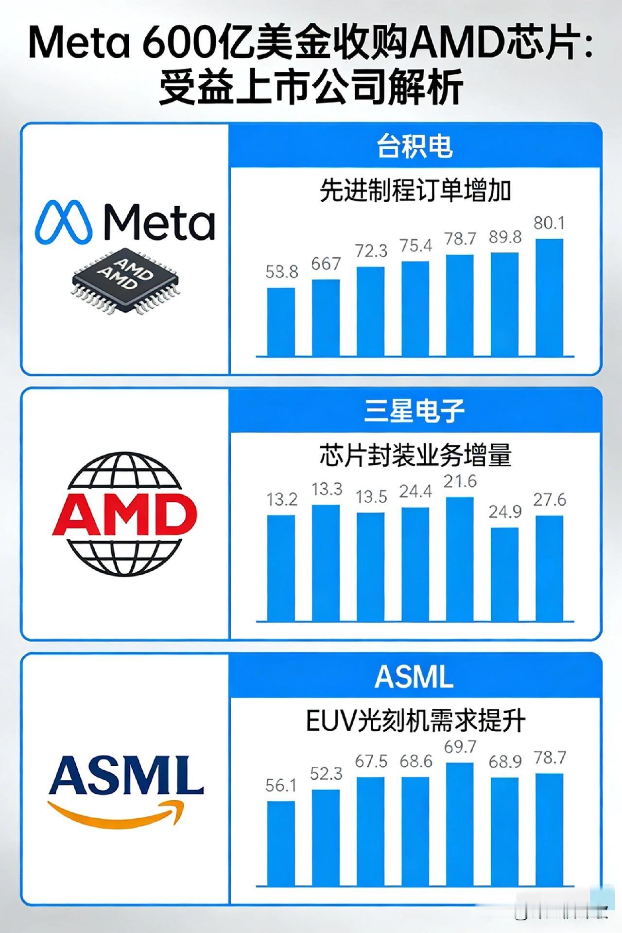 🔥Meta 600亿美金砸向AMD,A股这些公司直接受益! 深夜美股炸出核弹级利好!AMD盘前狂拉超35%,只因Meta砸下600亿美元,锁定未来5年6吉瓦AI芯片大单,还附赠1.6亿股认股权证深度绑定。这不仅是AMD挑战英伟达的关键一战,更是A股半导体产业链的狂欢夜! 一、封测环节:订单直接喂饱 通富微电(002156) 作为AMD全球最大封测供应商,承接了其80%以上的CPU/GPU封测订单,2024年AMD贡献了公司近60%的营收。这笔600亿美金的超级订单,将直接转化为通富微电未来几年的业绩增长,先进封装产能利用率有望持续拉满。 长电科技(600584) 全球封测龙头,覆盖高算力芯片封装全场景,3DIC封装技术全球领先。随着AMD AI芯片出货量激增,公司在先进封装领域的份额有望进一步提升。 二、IP与设计:核心技术伙伴 芯原股份(688521) 向AMD Alveo AI处理器视频处理引擎提供IP、设计、流片等全面支持,是AMD AI芯片IP授权及设计服务的核心合作伙伴。IP储备国内最丰富,Chiplet技术领先,将深度受益于AMD AI芯片的大规模量产。 ★★★海光信息(688041) 手握AMD x86指令集永久授权,国产服务器CPU龙头。AMD生态的壮大将带动本土算力需求,公司DCU芯片适配AI训练场景,有望迎来新的增长空间。 三、服务器与配套:算力基建刚需 ★★★中际旭创(300308) 800G光模块已批量应用于AMD MI300系列AI服务器,1.6T光模块完成兼容性测试,是AMD光模块的核心供应商之一。Meta 6吉瓦算力部署,将直接拉动高速率光模块的需求爆发。 胜宏科技(06669.HK) 手握AMD服务器高阶PCB订单,算力服务器每一台都离不开它。随着全球AI服务器产能扩张,公司高端PCB需求将持续放量。 世运电路(603920) 切入AMD AI服务器供应链,高端硬板需求持续放量,成长空间被彻底打开。   四、分销与整机:生态落地关键 中电港(001287) AMD授权分销商,承担数据中心CPU、Radeon/Instinct GPU的渠道分销,覆盖国内主流服务器厂商,将受益于AMD AI芯片在国内市场的推广。 华勤技术(603296) AMD MI300系列GPU的独家ODM合作伙伴,负责服务器整机硬件的全栈设计与量产,定制液冷散热方案可将服务器功耗降低25%,深度绑定AMD AI服务器生态。   五、投资逻辑:从订单到业绩兑现 这笔600亿美元的订单,不是一次性交付,而是未来5年的持续放量。Meta计划2026年先部署1吉瓦,后续逐年加码,这意味着相关供应链公司的业绩增长是可预期、可持续的。 更关键的是,AMD向Meta发行的1.6亿股认股权证,将双方利益深度绑定。Meta只有在AMD股价达到600美元时才能收到最后一批股票,这意味着Meta会全力推动AMD AI芯片的应用,而A股供应链公司则是这场盛宴的直接受益者。   ⚠️ 风险提示:AI芯片行业竞争加剧,订单交付不及预期,全球半导体周期波动。