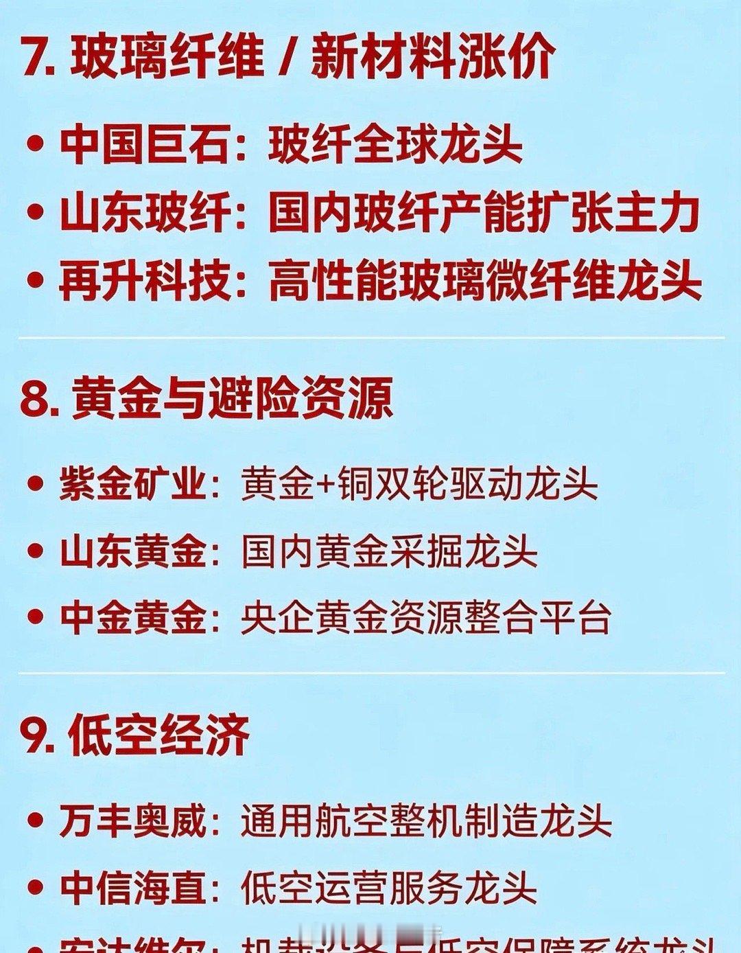 7. 玻璃纤维/新材料涨价中国巨石的玻纤产能全球占比超35%,受益于新能源汽车轻量化需求,高端产品提价5%-8%;山东玻纤加速产能扩张,年内新增产能将释放20%;再升科技的高性能玻璃微纤维在滤材与隔热领域多点开花,毛利率提升至42%。