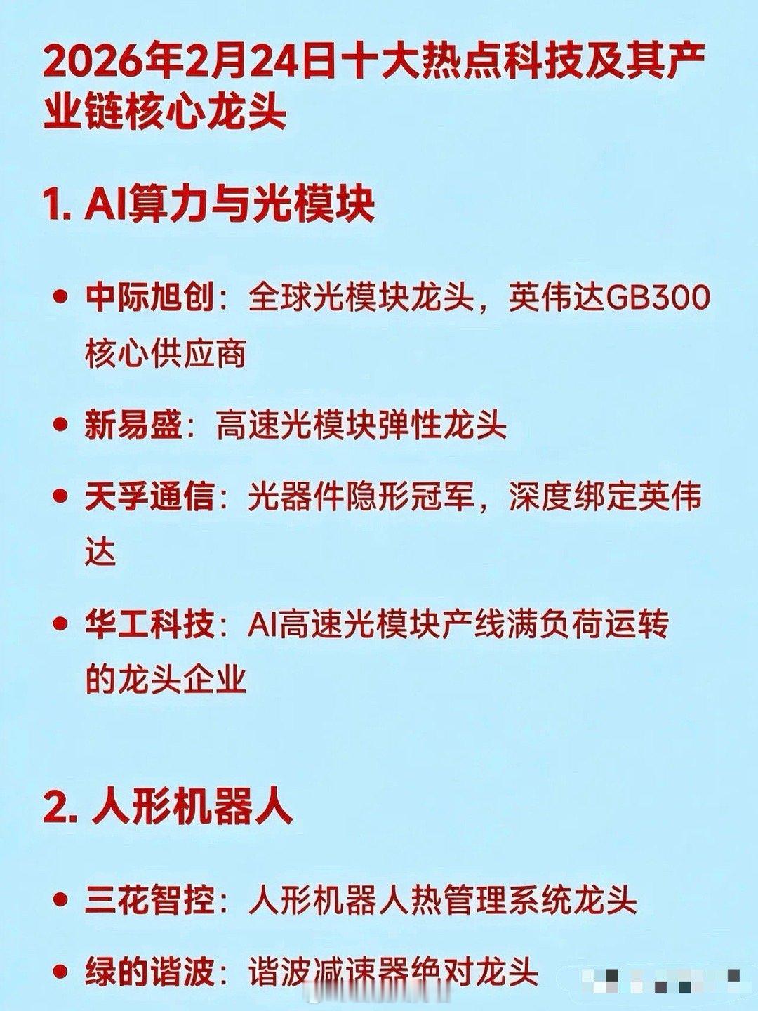 2026年2月24日,市场聚焦十大热点科技及产业链核心标的,各赛道龙头凭借技术壁垒与产业卡位持续领跑,具体如下: