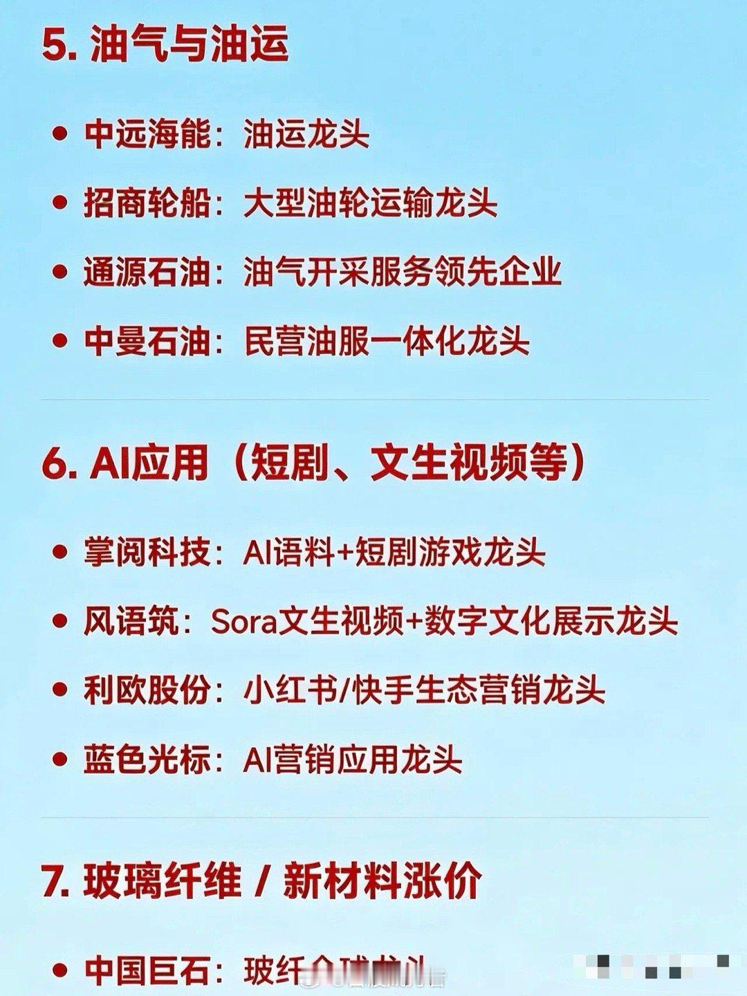 5. 油气与油运中远海能的VLCC船队利用率超90%,受益于国际油价回升与航线运价上涨,业绩弹性凸显;招商轮船的大型油轮业务量价齐升,跨洋航线收入同比增长65%;通源石油的页岩气开采服务订单饱满,压裂设备开工率维持高位;中曼石油的海外油田项目贡献稳定现金流,民营油服一体化优势持续释放。