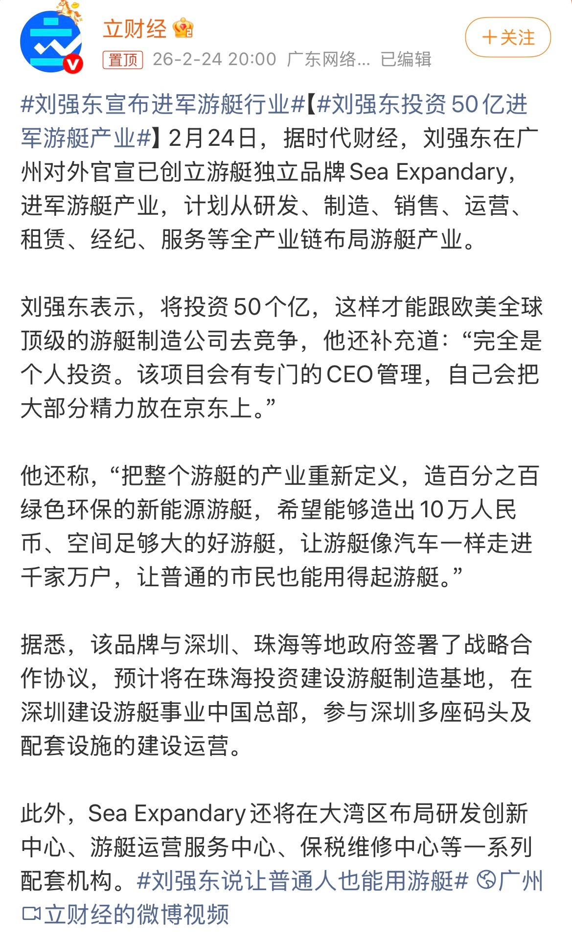 刘强东宣布进军游艇行业去年砸上百个亿为了挤进外卖行业,今年又要砸50个亿造游艇,话说,游艇有必要走进千家万户吗?普通人家没湖没江没海的,买游艇干啥,下大雨积水时用吗