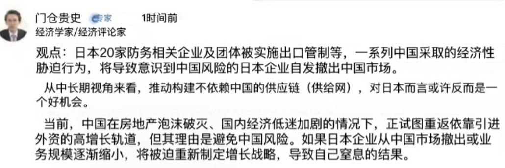 连发两条公告后,日本精英坐不住了:称中方是“作茧自缚,” 马年春节刚收尾,正月初八全国开工第一天,中国商务部就接连发布两份重磅公告,直接把三菱造船、川崎重工等 20 家深度参与日本军事化建设的实体,列入出口管制管控名单,同时把斯巴鲁等 20 家无法核实两用物项最终用途的日本实体纳入关注名单,覆盖日本海上、陆上、航空全领域军工核心链条。 这一记精准反制刚落地,国际上都看清了中方的态度 —— 这是针对日本加速推进再军事化、破坏地区安全稳定的正当回应,既不盲目扩大范围,也不针对普通日本企业。 可就在全世界关注事态走向时,日本国内一位名叫门仓贵史的经济学家却坐不住了,急匆匆跳出来公开发声。 他先是安抚日本企业,让大家不要过度悲观,甚至把中方的合理反制歪曲成日本的 “发展机遇”,声称中方的一系列举措,会倒逼日本企业主动撤出中国市场。 他还绘声绘色地描绘,短时间内日本企业或许会经历阵痛,但长期来看,能推动日本搭建起完全不依赖中国的供应链,对日本而言是一件大好事。 他还变本加厉地放出狠话,宣称如果中方继续坚持正当反制,就会引发日本企业乃至其他外资企业大规模撤离中国的局面,进而冲击中国经济,最后中方只会落得 “作茧自缚” 的下场。 这番话听起来像是站在经济角度分析,实则满是偏见与臆想,完全脱离了市场的真实情况。 这位日本经济学家看似顶着专业头衔,实则是挂羊头卖狗肉,根本不是在做客观的经济研判,而是带着明显的政治倾向发声。 他的政治理念与日本右翼政客高市早苗高度契合,本质上是借着经济专家的身份,为日本的军事化行径站台,刻意歪曲中方反制的初衷与边界。 中方的反制举措一直有着清晰的边界,官方早已明确表态,此次列管仅针对少数参与日本军事化的实体,相关措施只针对军民两用物项,丝毫不影响中日之间正常的经贸往来,也不会波及诚信守法的日本民用企业。 简单来说,中方打的是日本军工的 “七寸”,不是针对所有日本企业,这一点是这位日本专家刻意回避、闭口不谈的关键事实。 再看看日本企业的真实处境,就能明白这位专家的言论有多站不住脚。 当前日本大量制造业、商贸、电子、汽车等领域的企业,近三成的利润都来自中国市场,高端制造、精密零部件等产业,更是深度依赖中国的供应链与配套体系。 中国是全球规模最大、最稳定的消费市场,也是全球产业链中不可或缺的核心环节,日本企业早已和中国市场深度绑定,根本无法轻易剥离。 这些日本企业心里十分清楚,中方的反制和自身经营毫无关联,不仅不会撤离中国市场,反而会主动配合中方的合规要求,守住合法经营的底线。 毕竟没人会和真金白银的利润过不去,放弃中国市场,就等于放弃自身的生存与发展空间。 反观日本国内,普通日本企业对高市早苗等右翼政客的不满情绪正在不断加剧。 这些政客为了一己政治私利,无视日本企业的切身利益,无视日本经济的发展根基,一味推动军事化、无端挑起中日对立,把日本企业推向利益受损的境地。 在日本企业看来,这些政客的做法才是真正的祸国殃民,亲手摧毁日本经济赖以生存的根基,完全是不计后果的鲁莽行为。 所谓 “中方作茧自缚” 的说法,本质上是颠倒黑白、自欺欺人。 真正束缚日本发展的,从来不是中方的正当反制,而是日本自身执意走军事化路线、破坏地区和平稳定的错误选择。 全球产业链供应链经过数十年发展,早已形成深度融合、不可分割的格局,根本不是靠主观意愿就能随意割裂的。 日本想要凭空打造 “不依赖中国的供应链”,完全是不切实际的空想。 抛开中国庞大的消费市场、完善的产业链配套、稳定的生产环境,日本根本找不到可以替代的合作方案。 强行推动脱钩断链,最后只会让日本企业成本飙升、市场萎缩、利润暴跌,让日本经济陷入长期困境,这才是真正的自食苦果。 中方始终坚持开放合作的态度,中国市场的大门一直向所有合规经营的各国企业敞开。 日本企业只要不参与军事化、不做危害地区安全的事,就能在华安心经营、共享发展红利。 这位日本精英的言论,不过是日本右翼势力的嘴硬逞强,既违背经济规律,也不符合日本企业的真实利益。 日本真正该做的,是认清时代潮流,停止军事化冒险,回到和平发展的正确轨道上,而不是被少数政客和伪专家裹挟,做出损害自身利益、破坏地区稳定的蠢事。 毕竟,市场规律不会因嘴硬而改变,逆时代潮流而动,最终只会被现实狠狠教训。