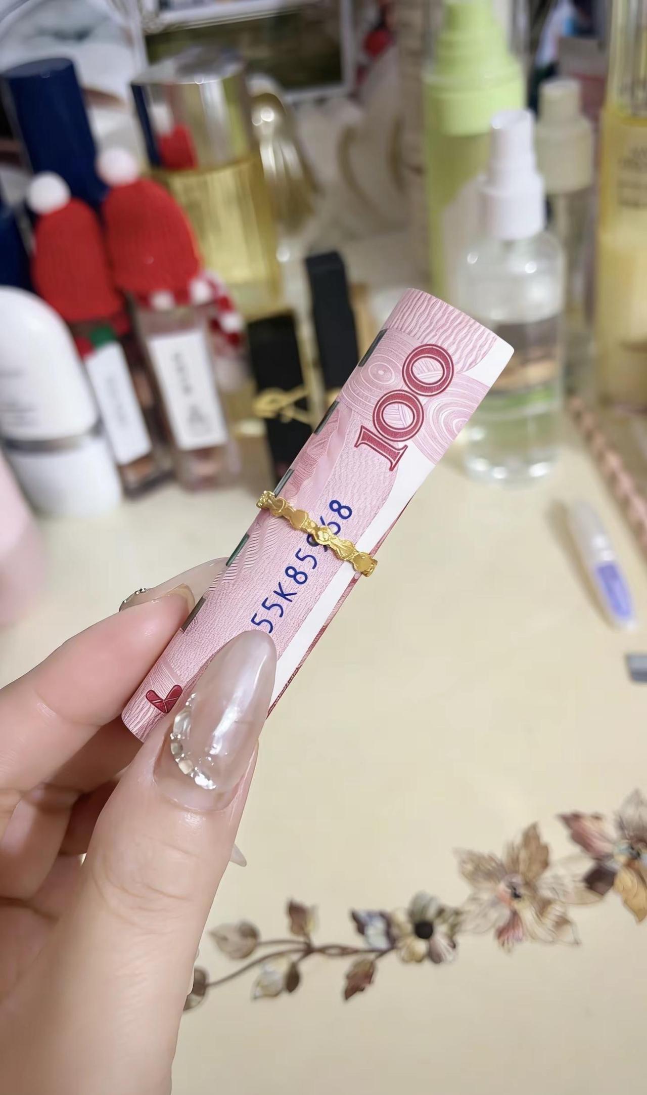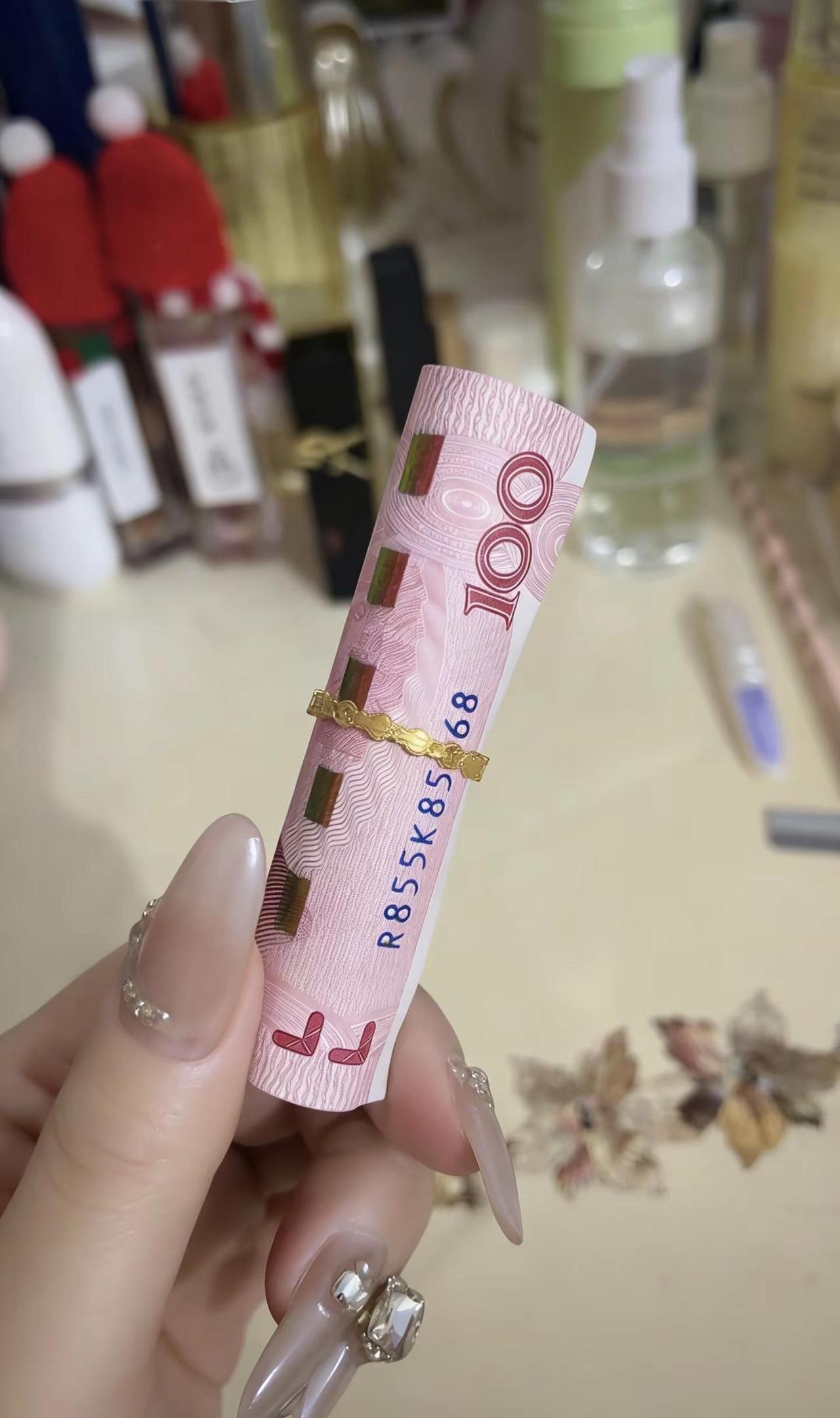 戒指套住人民币,财富环绕,钱和福气都握住,主打一个“指”定发财,