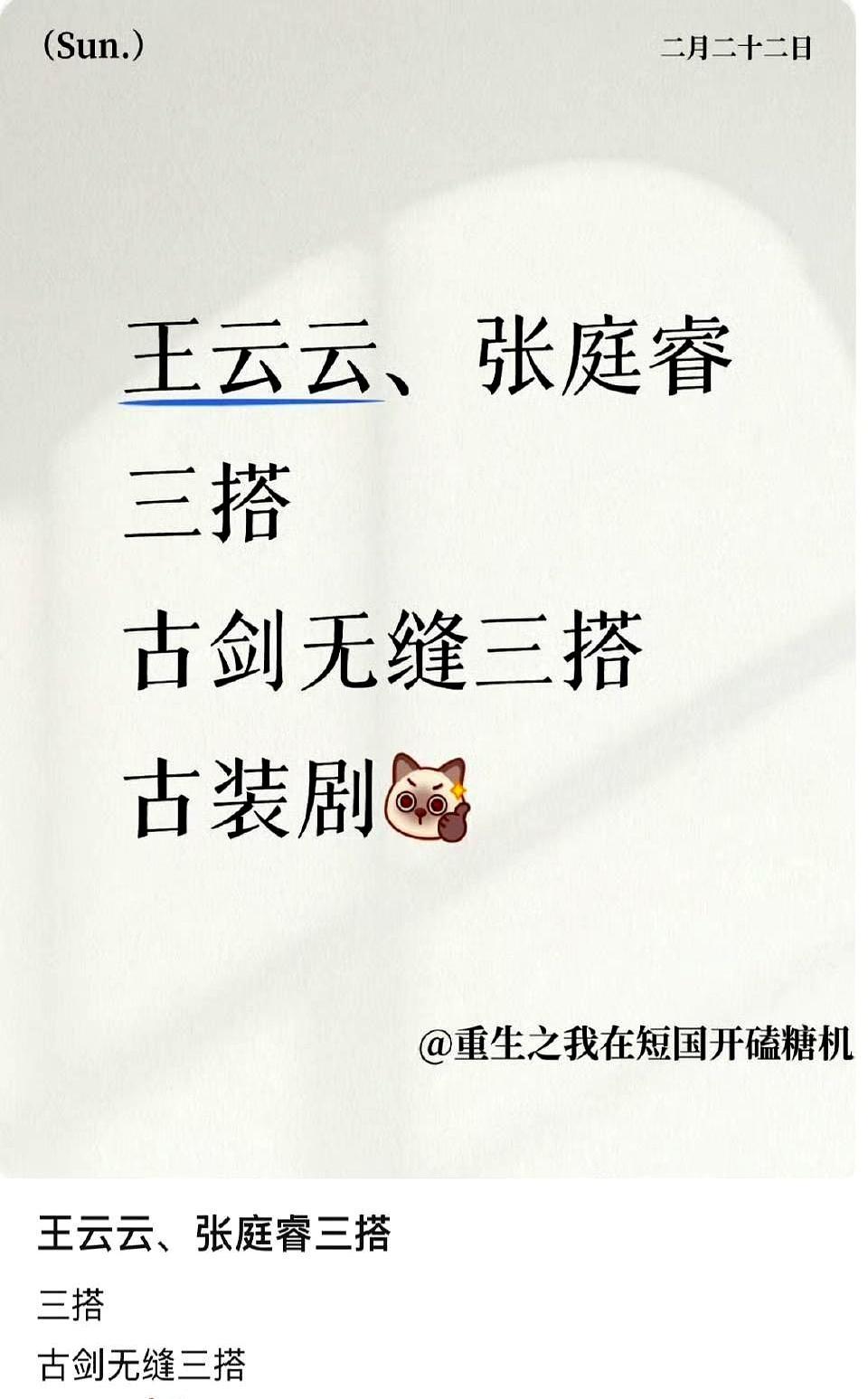 短剧圈月底要变天了,郭宇欣那边17个站姐已经扛着百万设备冲了。 另一边,徐梦洁直接拿下《好一个乖乖女》横屏版,搭档任世豪,原版短剧的男主直接没了姓名。 还不止。余茵甘望星三搭现代剧,王云云张庭睿三搭古装,全都挤在3月初开机。粉丝碗里的饭还没吃完,下一碗直接端上来了。 这么多对CP扎堆开机,你赌哪一对能杀出来?