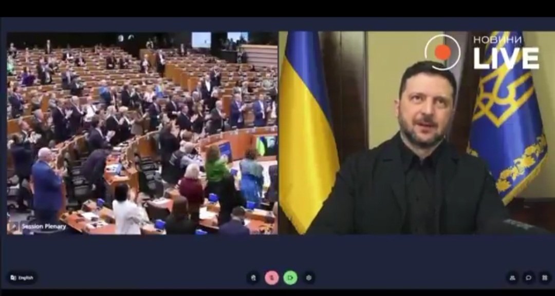 歐洲議會全體起立,為澤連斯基與烏克蘭人鼓掌近兩分鐘。