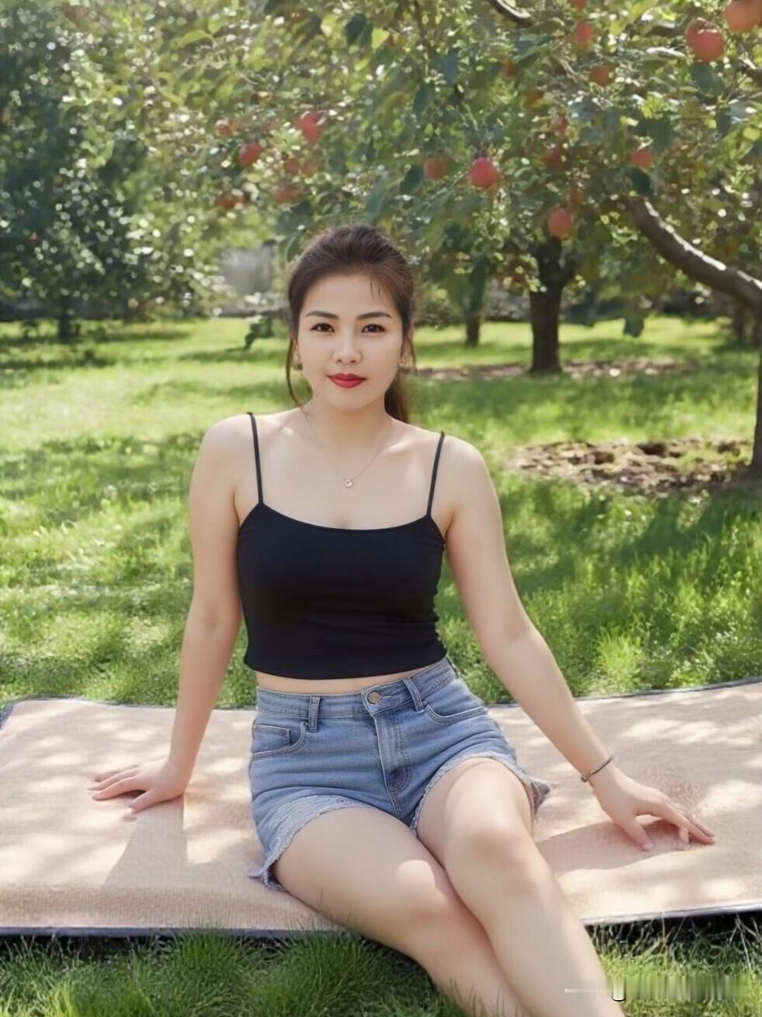刘涛 坐在草地上,笑容甜美,周围是红苹果树,真是个阳光明媚的好天气!