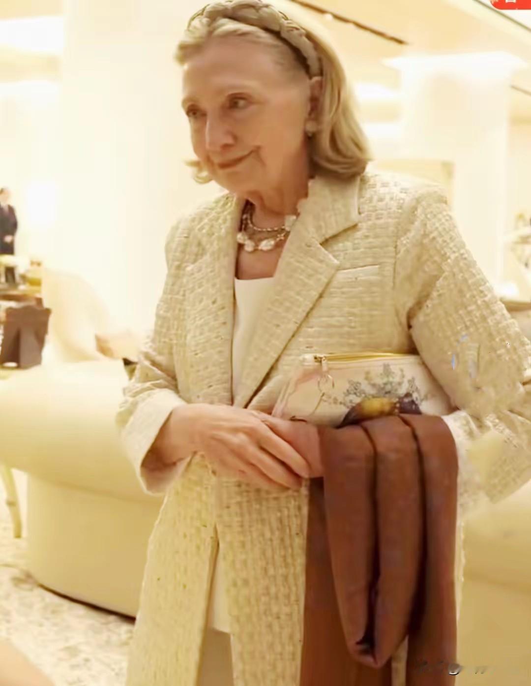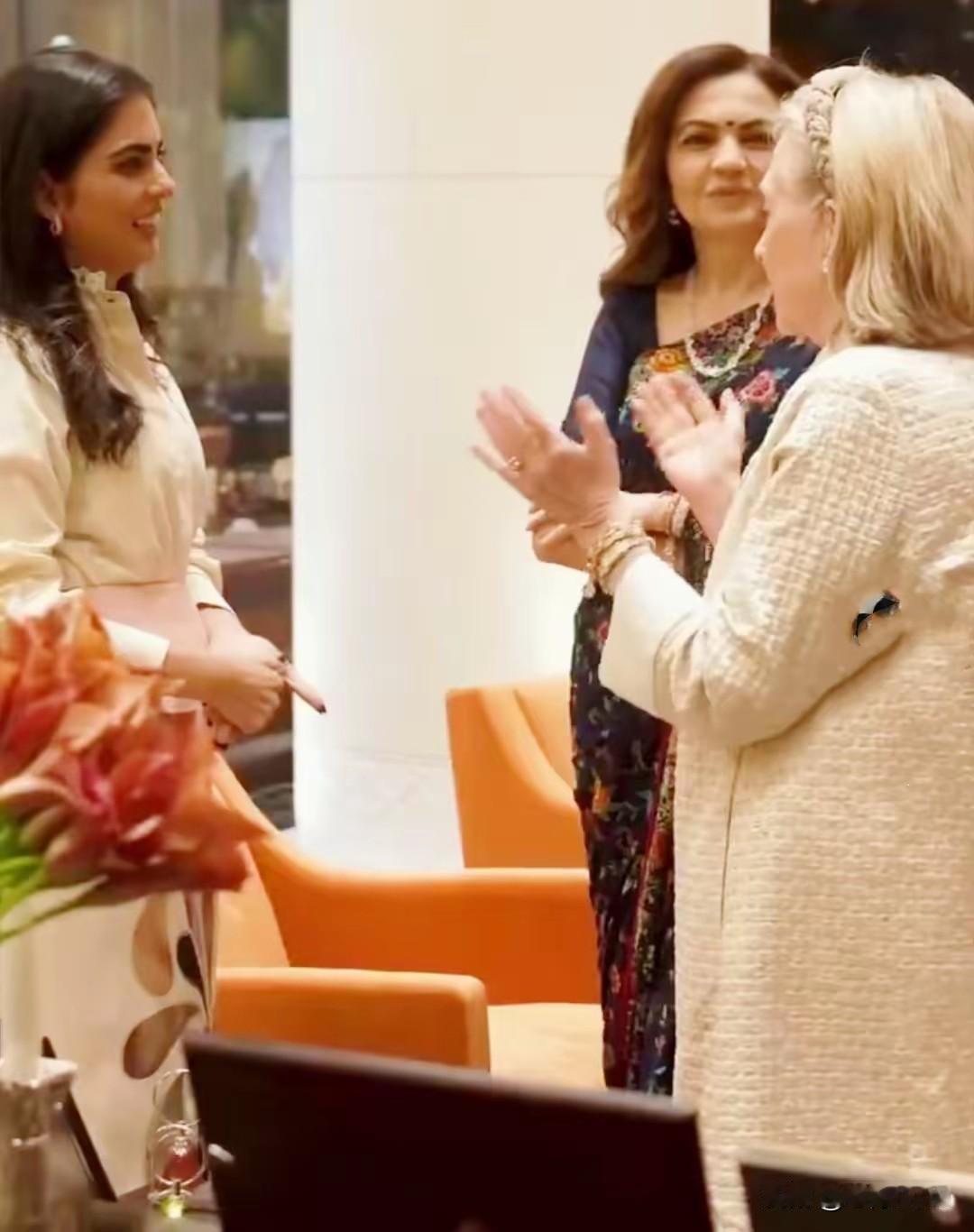 78岁希拉里面见印度首富光 脚踩地毯发量惊人 78岁希拉里近日受邀到访印度首富安巴尼家族的27层豪宅,穿中长款米色不规则图案外套,光脚踩地毯,发量惊人皮肤白,与安巴尼家族成员参观珍宝、听古琴并亲密合影,其穿搭简约高级,为小个子女性提供穿搭范本。