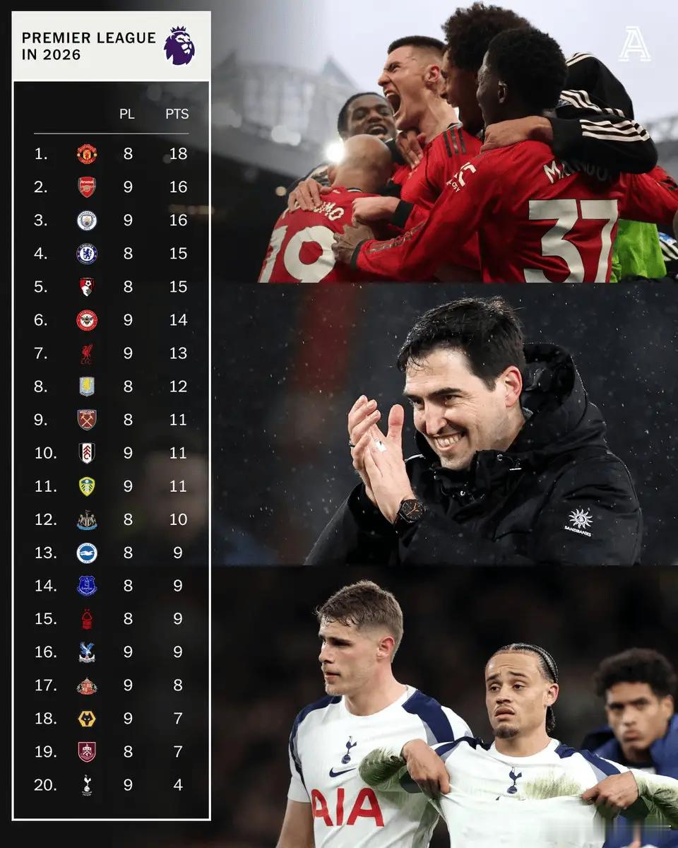 2026年英超积分榜:曼联不败18分居首,热刺不胜4分垫底,英超“2026自然年”积分榜更新:曼联以8场18分领跑,同时也是2026年以来联赛唯一保持不败的球队。身后阿森纳、曼城同为9场16分紧追,切尔西与伯恩茅斯则以8场15分紧随其后。