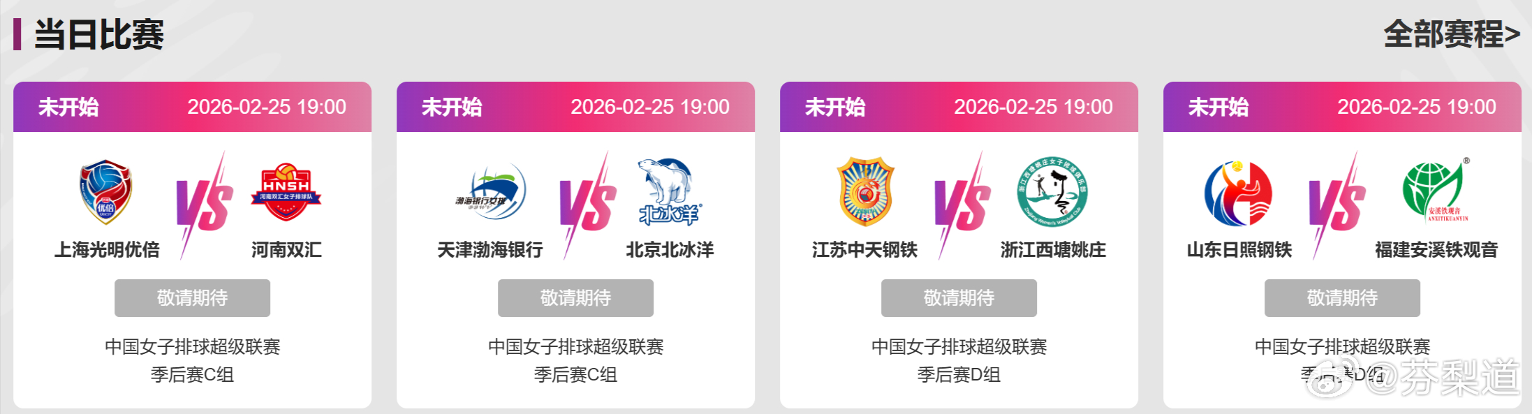 排超联赛2025-2026中国女排超级联赛【赛事预告】2025-2026赛季中国女子排球超级联赛 A级季后赛第十五轮激战在即!🔥 🗓️ 具体赛程如下:📍 19:00|上海光明优倍 🆚 河南双汇📍 19:00|天津渤海银行 🆚 北京北冰洋📍 19:00|江苏中天钢铁 🆚 浙江西塘姚庄📍 19:00|山东日照钢铁 🆚 福建安溪铁观音微博官方号,DY、企鹅体育、WX视频号和央视频都有直播