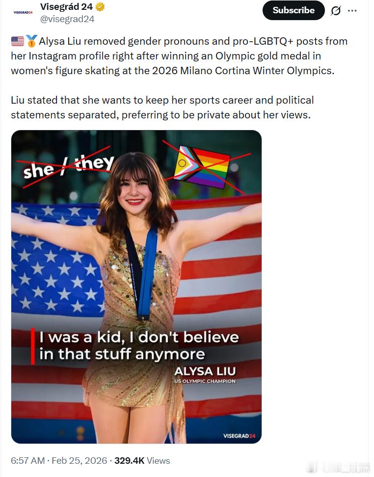 艾丽莎·刘在赢得2026年米兰-科尔蒂纳冬奥会女子花样滑冰金牌后,立即从她的Ins主页上删除了性别代词和支持LGBTQ+的帖子。