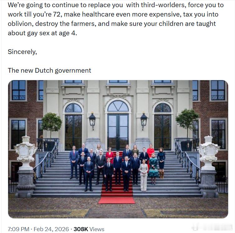 “我们将继续用第三世界国家的人取代你们,强迫你们工作到72岁,使医疗保健更加昂贵,对你们征收天文般的税收,毁掉农民,并确保你们的孩子从4岁起就被教育关于同性x行为的知识。”