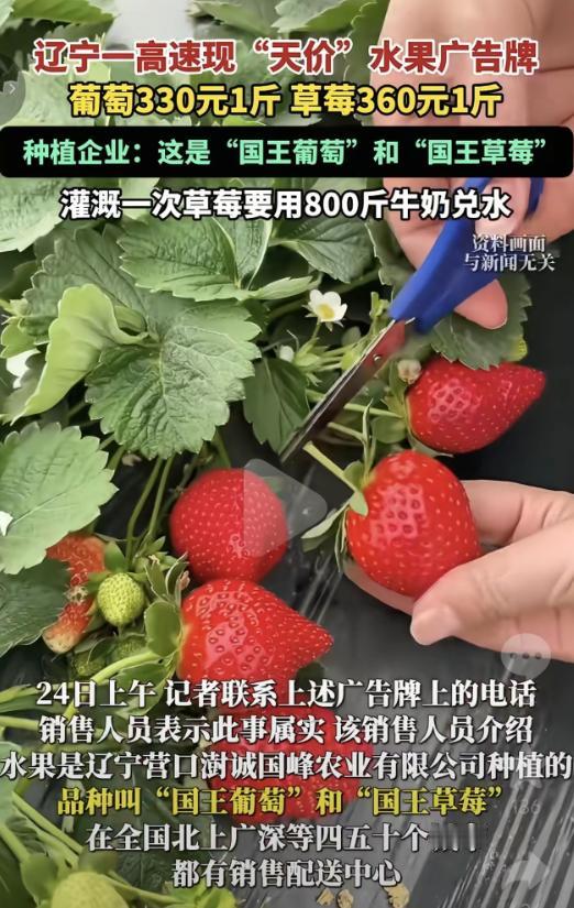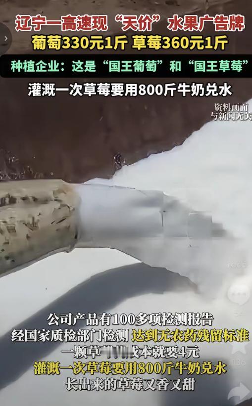 活久见!草莓都喝上牛奶了,有网友称在高速路上看到广告牌上,葡萄330一斤,草莓360元一斤,种植企业:这是“国王葡萄”和“国王草莓”,每棵草莓苗成本4元,灌溉一次草莓需要用800斤牛奶兑水,长出来的草莓又香又甜。 最近刷到个事儿,真是活久见,差点没反应过来——有辽宁网友在高速上开车,无意间看到一块广告牌,上面的价格直接看懵了,葡萄330一斤,草莓360一斤! 发布视频的网友说,自己就是本地人,看到这个价格都惊呆了,完全超出了认知,评论区里更是炸开了锅,有人调侃“这葡萄是镀了金吧”,还有人说“吃一颗草莓,相当于喝两杯奶茶”。 这事儿可不是网友造谣,相关企业很快就出来回应了,说广告牌上的内容都是真的,这两种水果不是普通品种,名叫“国王葡萄”和“国王草莓”,是他们辽宁营口一家农业公司种植的。 他们说之所以卖这么贵,全是因为种植成本高、品质好,草莓苗一棵就要4块钱,还是专门从中国农科院引进的,种草莓的土也不一般,是用黑龙江的非转基因大豆豆饼养出来的。 就连灌溉都特别讲究,一次就得用800斤牛奶兑水浇下去,说是这样能提升草莓的甜度和香气。 除此之外,他们还说这些水果全程不打农药,经过了100多项检测,没有农药残留,定位的是高端礼品市场,在全国四五十个城市都有销售配送中心,批发价是400元2斤,算下来一斤也得200块。 我查了下这家公司的情况,2022年才成立,注册资本只有10万块钱,更有意思的是,年报显示连续多年参保人数都是0,可他们却说这两种水果已经卖了三年了,难免让人有点疑惑。 说实话,我看完之后心里满是疑问,咱先不说别的,就说牛奶灌溉草莓这事儿,有懂种植的人说,牛奶里的蛋白质没法直接被草莓吸收,得发酵分解之后才行。 不然不仅起不到作用,还可能让土壤板结,影响草莓生长,其实效果和普通有机肥也差不多,说白了,这更像是一种营销噱头。 再说说价格,现在市面上最好的有机草莓,一斤也就一百来块钱,就算是出口级别的高端水果,单价也很少能突破两百,这360一斤的草莓、330一斤的葡萄,溢价确实太高了。 我在想真的会有人愿意花这个价钱买吗?大概率还是针对高端礼品市场,普通人肯定舍不得下手。 其实市场经济,商家想走高端路线、卖高价没问题,但前提是价格得对得起品质,不能靠这些花里胡哨的噱头误导消费者,这家公司的这些说法,到底是真的品质过硬,还是单纯为了抬高价收割智商税,现在还不好说。 说白了,优质水果的口碑是种出来的,不是吹出来的,要是真的像他们说的那么好,就算价格高一点,慢慢也能被市场接受;可要是光靠“牛奶灌溉”“国王品种”这些概念炒作,就算一时能吸引到消费者,时间长了,也迟早会被市场淘汰。 咱普通人看看热闹就行,至于买不买,还是得理性一点,别花了冤枉钱。