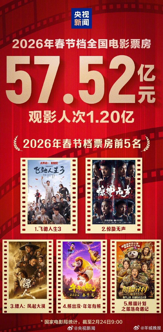 【你想去电影院重温哪一部春节档?】据国家电影局统计,截至2月24日9:00,2026年春节档票房为57.52亿元,观影人次为1.20亿。来聊聊哪部春节档最好看?你最想重温哪一部?《飞驰人生3》谢霆锋 单飞##网友偶遇谢霆锋狄波拉逛街##翟子路 男二##郭晓婷王天辰拍立得合照##易烊千玺凭演技惊艳韩国人##沈腾设计的超帅反踹车门没给镜头#(编辑:杨雨桐;审签:周乐瑞)