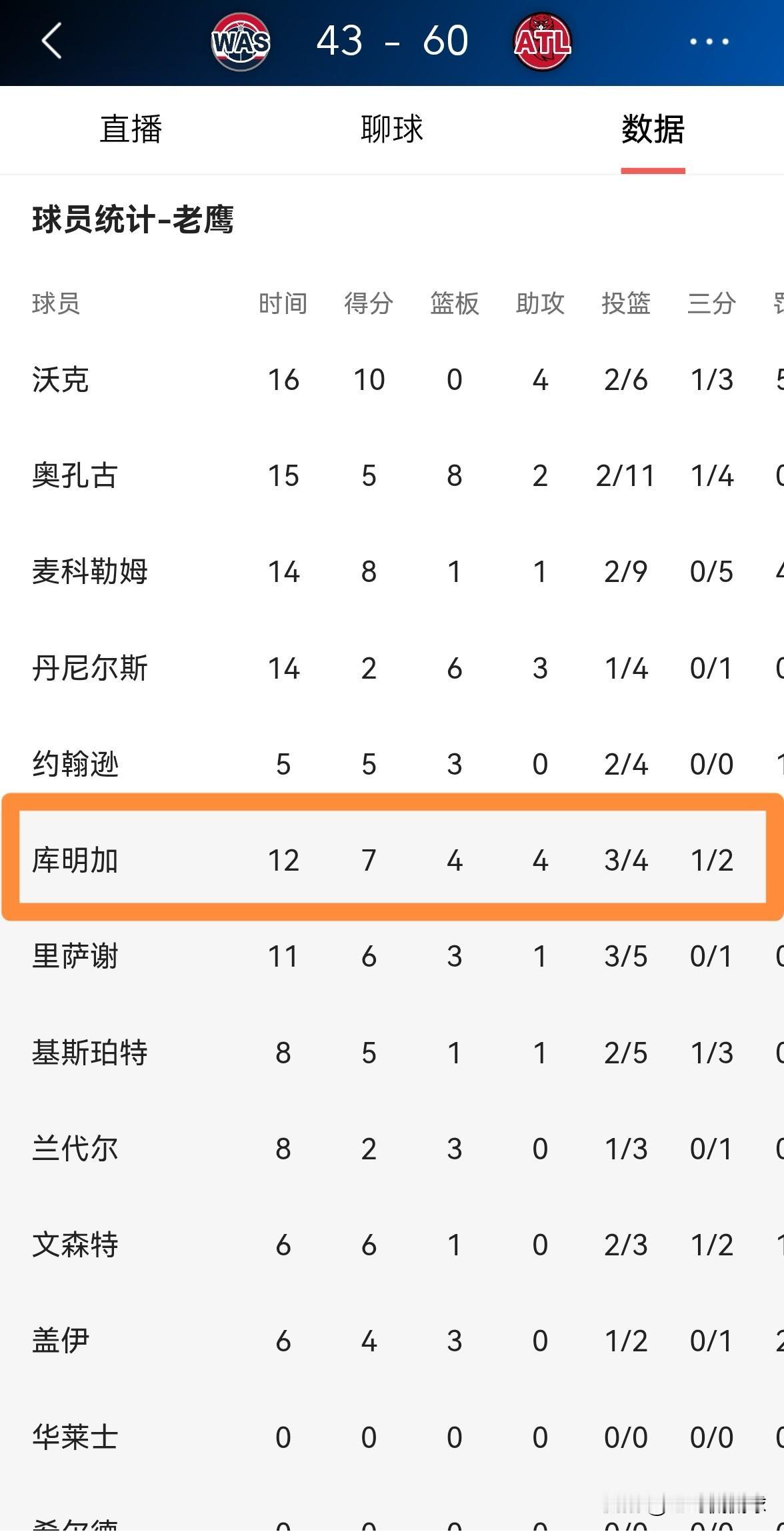 老鹰新援库明加狠狠地打了老东家勇士的脸!在今天老鹰主场迎战奇才的比赛中,目前双方半场战罢,老鹰以60:43领先对手。值得注意的是,本场比赛库明加迎来了自己老鹰生涯的首秀并且表现出色。 在前两节比赛中,库明加替补出战12分钟,投篮4中3,其中三分球2中1非常高效的砍下7分,外加4篮板4助攻1抢断,他的场上正负值为+12。 我相信当勇士管理层看到库明加的精彩表现时,他们一定哭晕在厕所里了,而库明加则用自己的出色表现狠狠地打了勇士的脸。