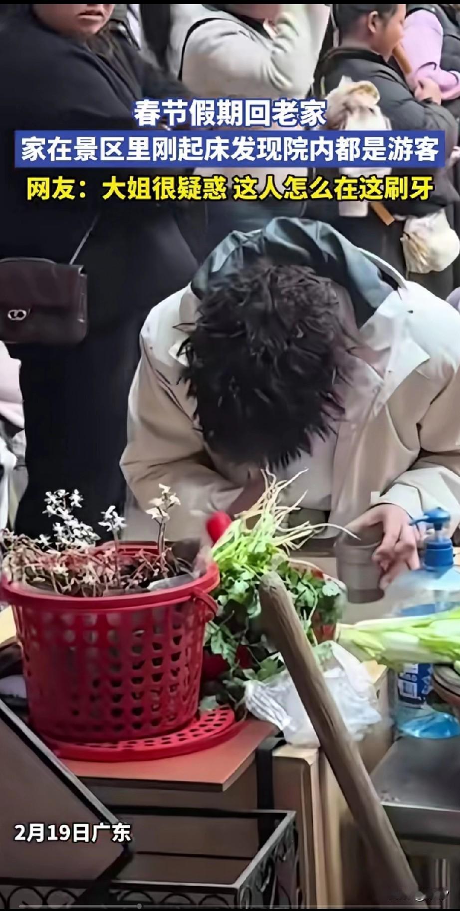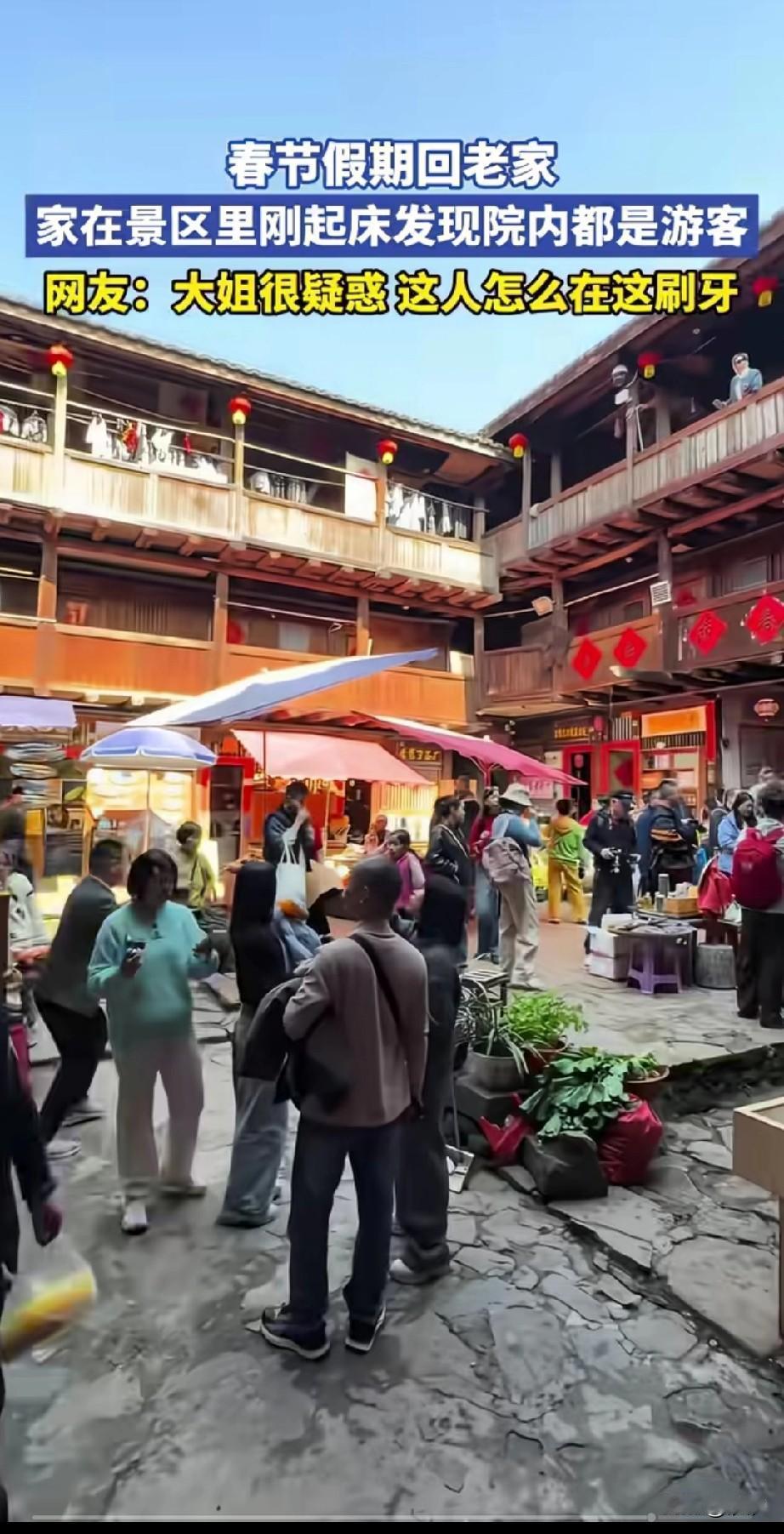 男子春节过年回家, 一觉睡到了大天明, 起来之后发现院子里全是游客, 不过他也没有不好意思, 毕竟这样的场面见多了, 于是就在院子里开始刷牙, 旁边的一位大姐的表情亮了, 他看到这位小伙子在这里刷牙, 满脸有些疑惑, 但是还有点儿不屑, 天天在想在这里刷牙,真是没素质, 他没有想到这地方是人家家, 家里面作为的景区, 小伙子起来就遇到了这么多游客, 这一波操作直接把网友看笑了, 网友都很羡慕他有这样的家, 毕竟这样好看的房子不多见, 大家知道这是哪里吗? 广东 过年回家