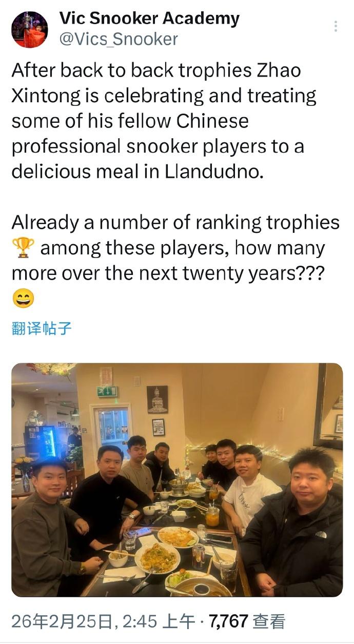 斯诺克:完成背靠背两连冠后,趁大家都在威尔士打比赛,赵心童做东请客肖国栋、袁思俊、庞俊旭、张安达、周跃龙、江俊等中国球员一起聚餐庆祝。